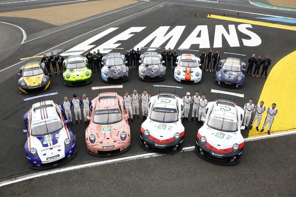 Dit jaar staan er maar liefst tien Porsches aan de start in Le Mans, waarmee Porsche het best vertegenwoordigde merk in de race is. (Foto: Porsche AG)