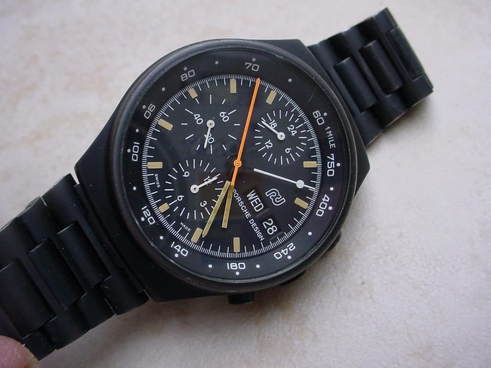 Nu had Porsche natuurlijk gemakkelijk het horloge in licentie kunnen laten produceren door Heuer, Rolex of 1 van de andere grote uurwerkproducenten, maar Ferry’s oog was gevallen op het kleine familiebedrijf Orfina in Grenchen. In die tijd was het eigenlijk helemaal niet gebruikelijk om een horloge helemaal zwart uit te voeren, dus de technieken om een horloge zwart te maken waren ook nog lang niet zo geavanceerd als nu. De eerste versies van deze horloges waren in een soort dunne zwarte poedercoat gehuld, met een licht spetterige structuur. De coating sprong er relatief makkelijk vanaf en op oude foto's van Porsche-familieleden zie je de klokken dan ook regelmatig terugkomen, maar dan volledig gestript als roestvrij stalen blanke versie. Deze coating wordt vaak als PVD gezien, maar deze PVD coatingtechniek werd pas later op de Porsche Design-horloges toegepast.