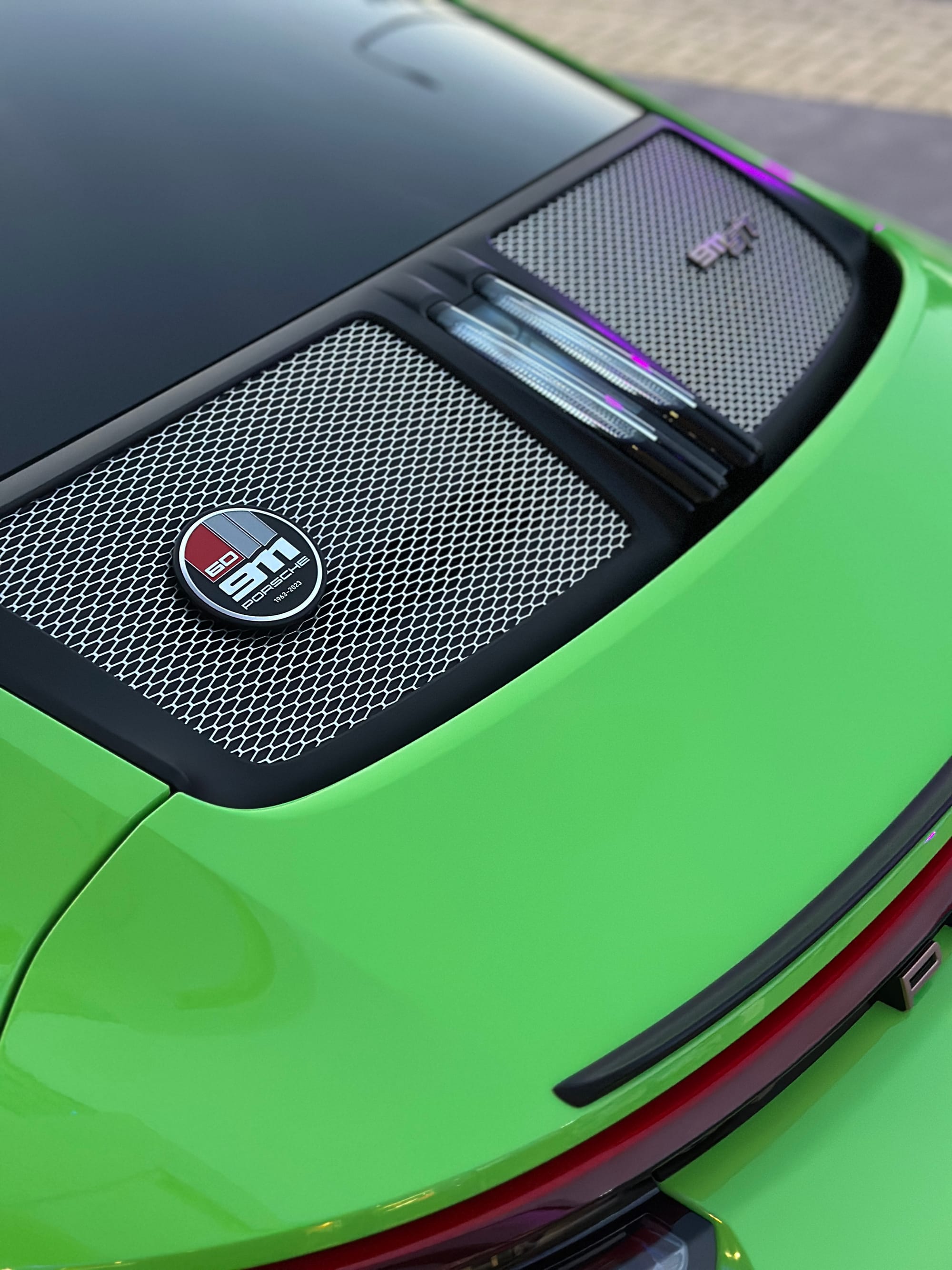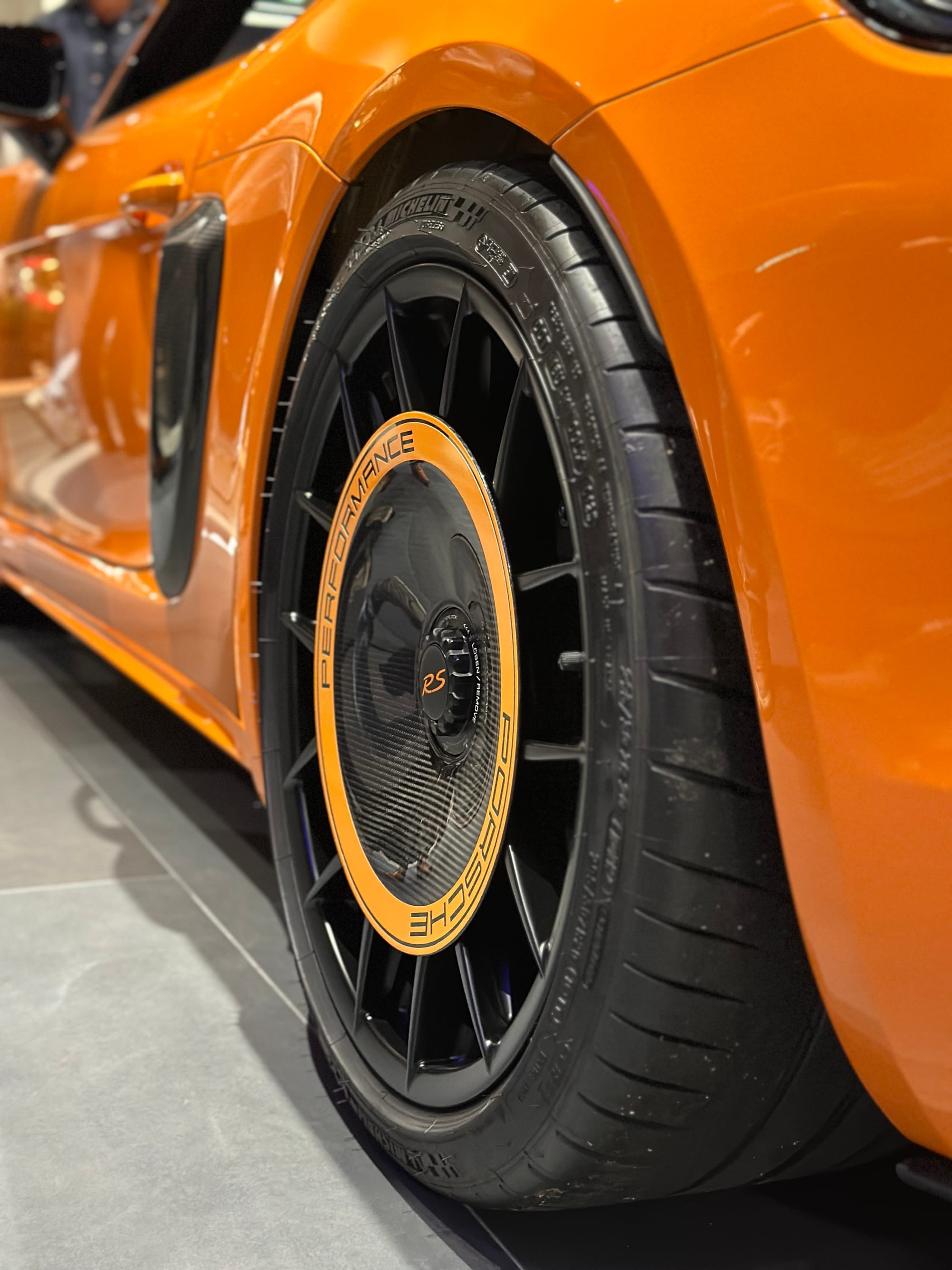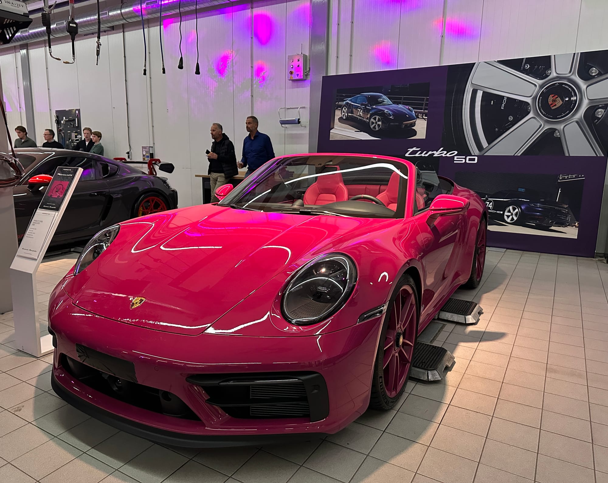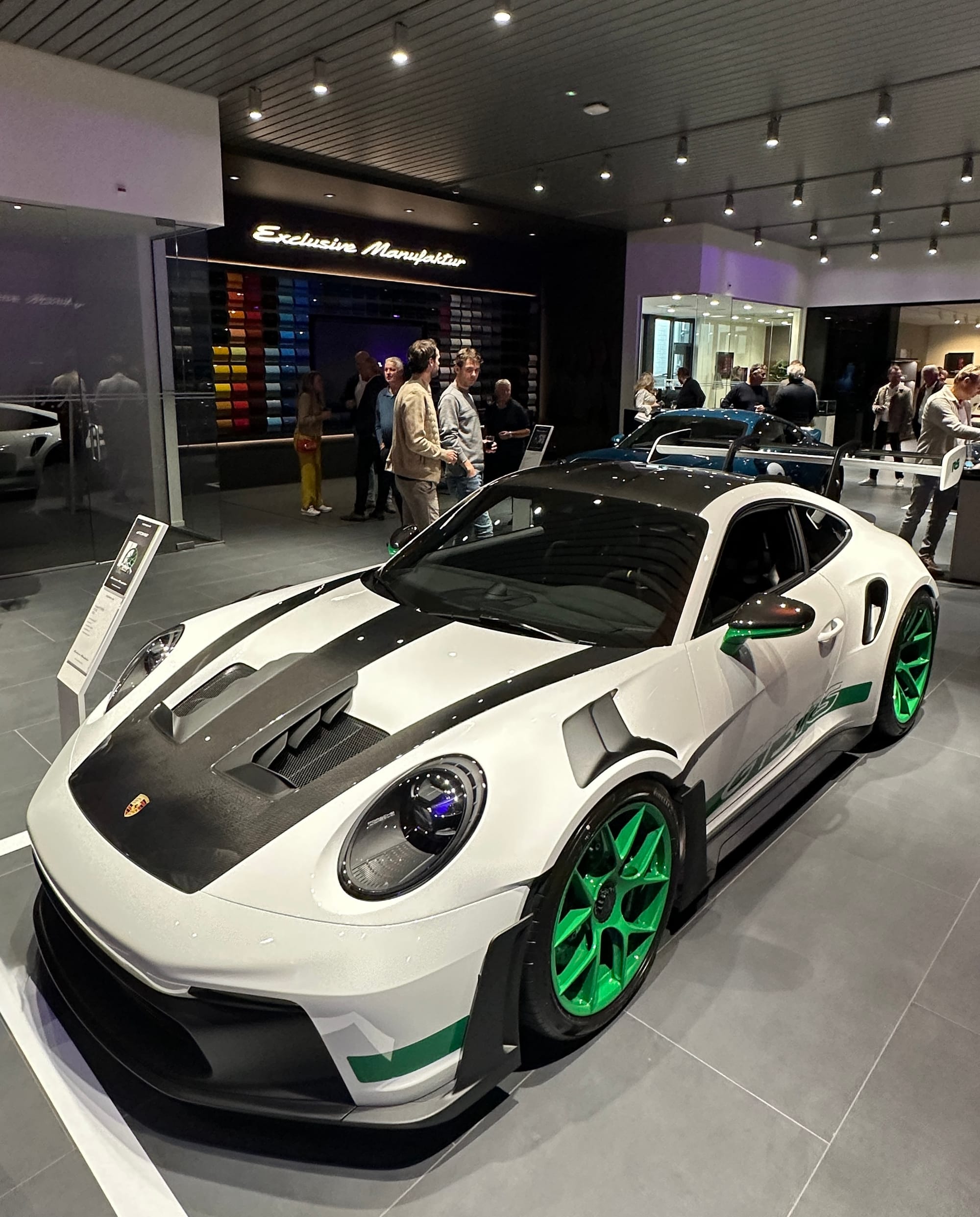 Ook in de showroom stond een fraaie selectie bijzondere Porsches opgesteld, beginnend met de 911 Spirit 70, de derde reeks uit de gelimiteerde ‘Icons of cool’-serie en met de kleurstelling in Olive Neo en de pepita-bekleding een hommage aan de jaren zeventig. Vervolgens de speciaal voor Nederland gemaakte oranje 718 Cayman GT4 RS ‘Tulp’ met Manthey-kit, die we al eerder zagen tijdens de Formule 1-Grand Prix op Zandvoort. Ook een 911 GT3 RS in Pure White met groene kleuraccenten uit 2025 was een ‘one-off’. Een recente Sport Classic uit 2022 op basis va de huidige modelreeks 992 in Fjord Green was nummer 1012 uit de reeks van 1250 exemplaren. Een 911 Turbo van dit jaar kwam ook uit een speciale serie van 1250 stuks ter gelegenheid van het 50-jarig jubileum van de turbotechnologie bij Porsche. Ook een exemplaar uit de speciaal voor Nederland gebouwde reeks van de Carrera 4S Ben Pon Jr. is een gelimiteerde uitvoering.