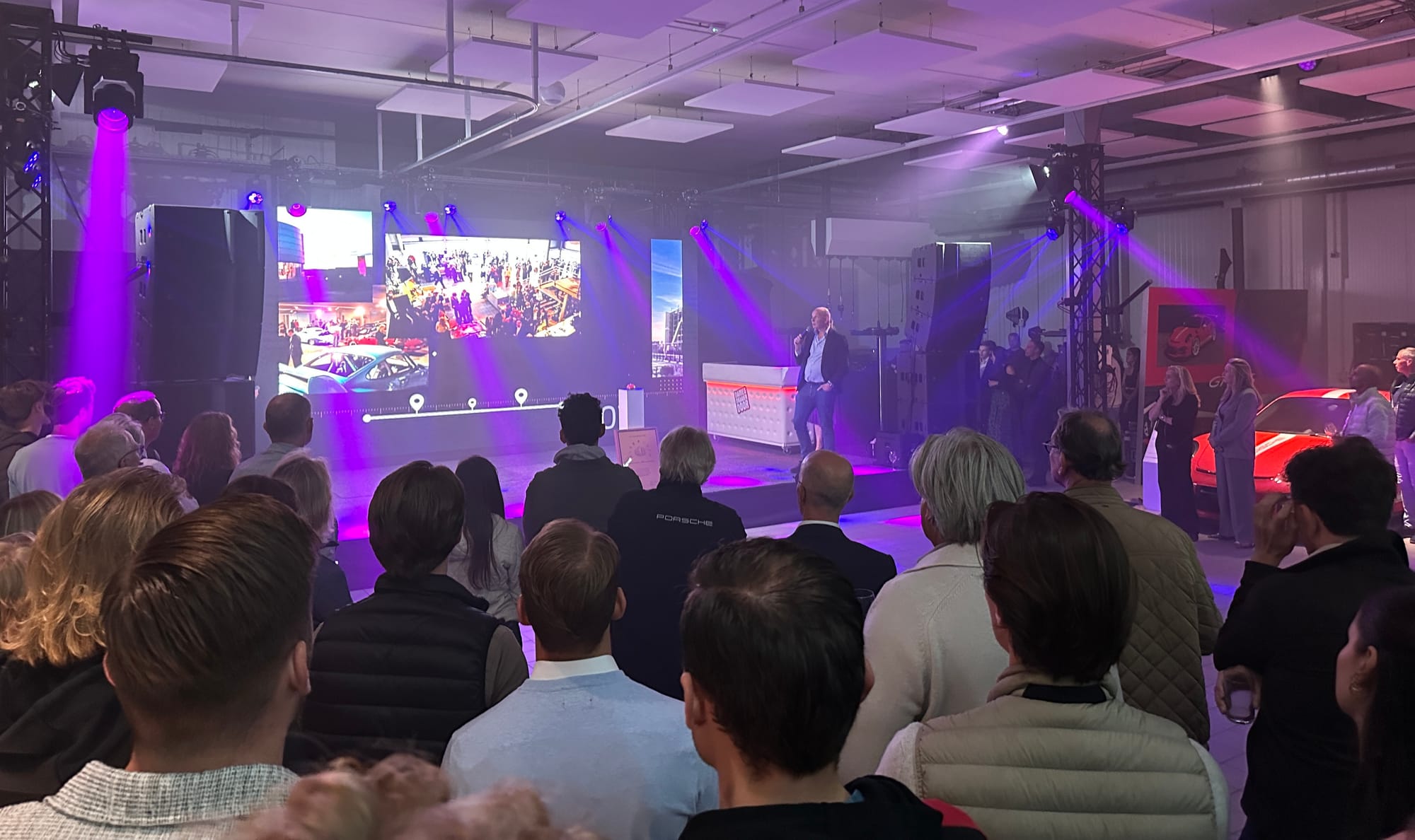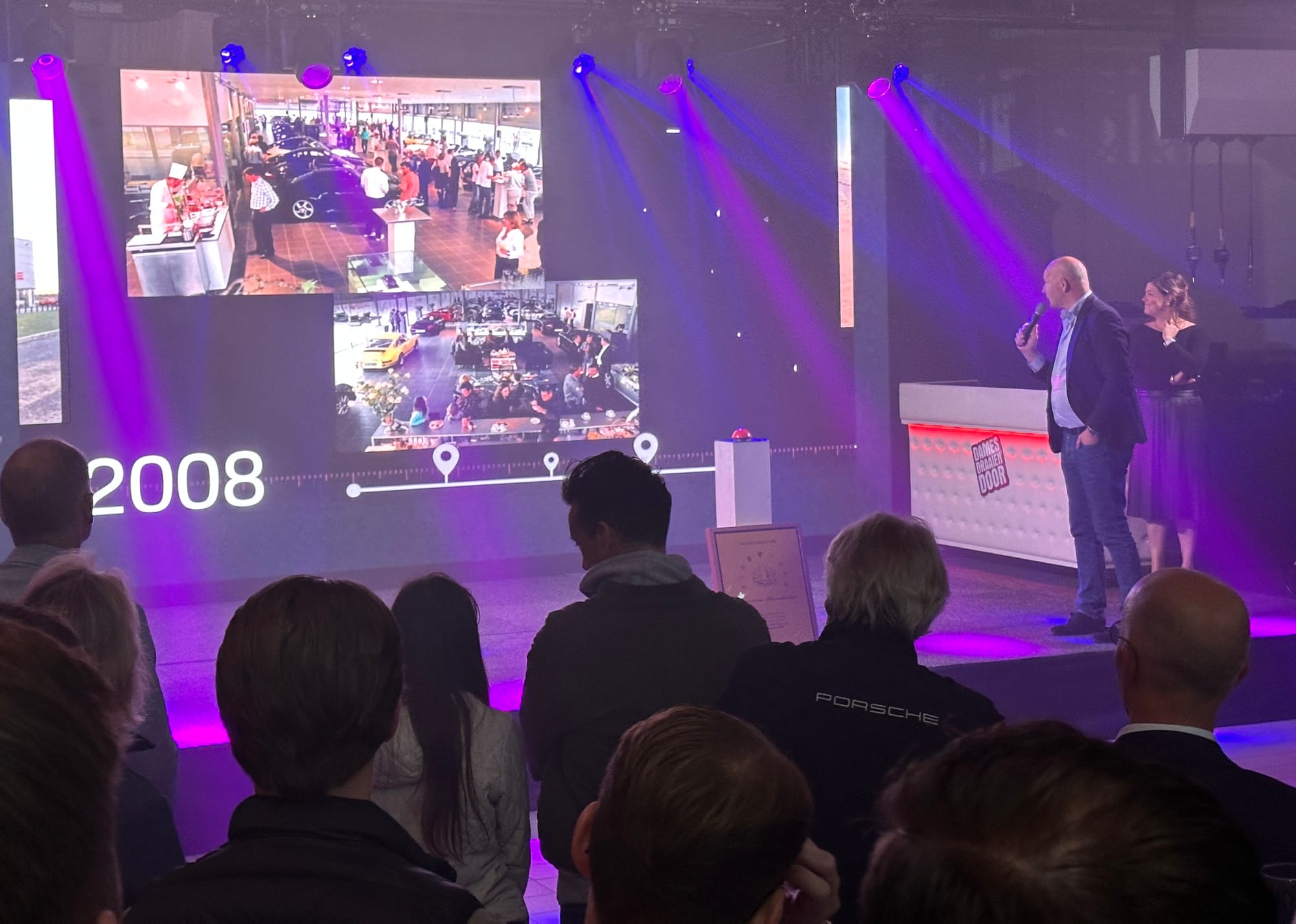Directeur en eigenaar Mark Wegh verwelkomde de gasten en toonde zich verheugd over de grote opkomst. In een korte terugblik liet hij de 20-jarige geschiedenis van het Porsche Centrum Gelderland de revue passeren, van het prille begin met twaalf medewerkers en acht bruggen tot de huidige omvang van de organisatie met 265 mensen en 92 bruggen. Mijlpalen als de eerste uitbreiding – al na twee jaar – en de opening van het Porsche Classic Center, de recordrit met de Rijkspolitie-Porsches, het 15-jarig bestaan dat gedwongen door corona digitaal gevierd werd, de inmiddels jaarlijkse Porsche Collectors’ Day en de deelname aan evenementen als de Mille Miglia, het concours op Mariënwaerdt en de diverse ritten en rally’s kwamen onder de aandacht.