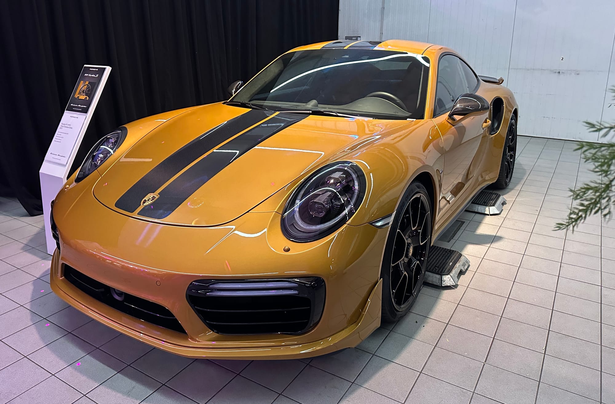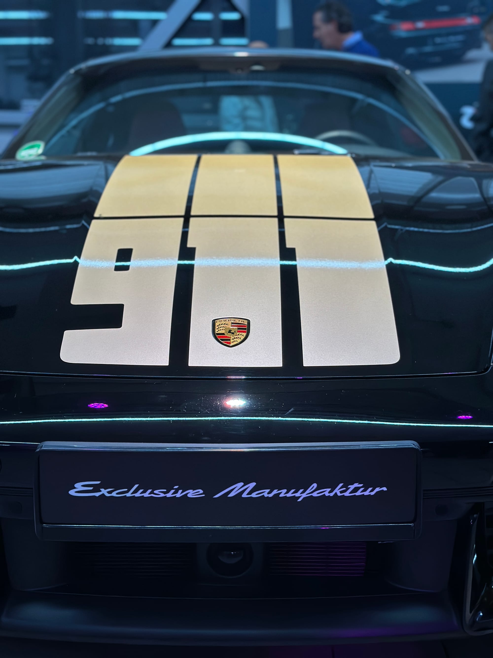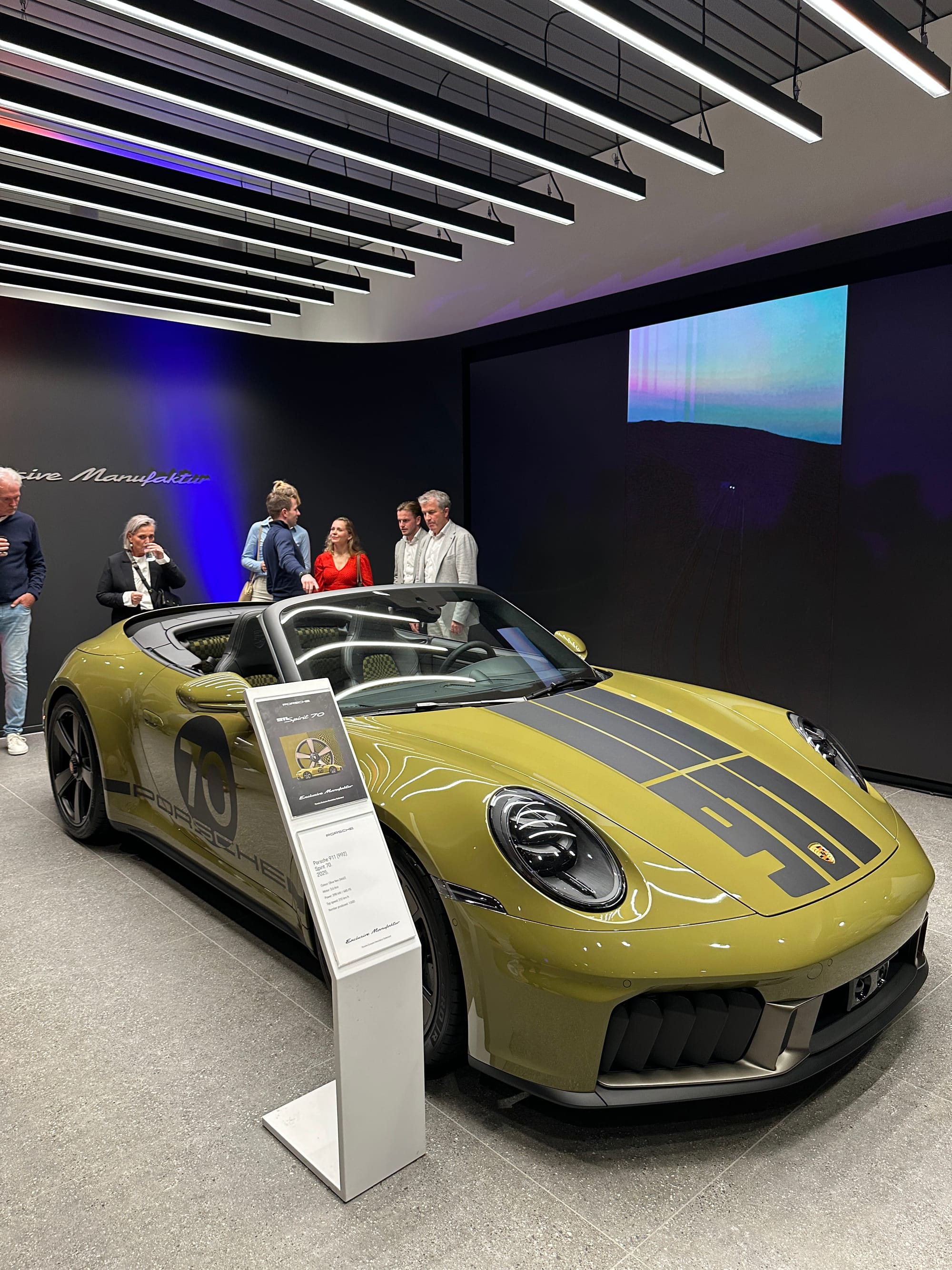In de werkplaats was er ook heel wat fraais om van te genieten. De oudste auto was een zwarte 911 Turbo uit 1975 met gouden kleuraccenten, bouwreeks 930, afkomstig uit de JFD Collection van de Belgische verzamelaar Johan Dirickx, die een aantal auto’s uit zijn indrukwekkende verzameling ter beschikking had gesteld. “Mark en ik kunnen het uitstekend vinden, dus toen hij vroeg of hij een aantal auto’s mocht laten zien, zei ik natuurlijk ja”, aldus Dirickx. Bijpassend meubilair maakte de presentatie helemaal af. Bijzonder was ook een 911 Turbo S Edition 918 Spyder, waarvan er 146 zijn gemaakt, voor mensen die al een 918 Spyder hadden besteld en een 911 in vergelijkbare uitvoering mochten kopen om de wachttijd voor de 918 Spyder enigszins te overbruggen. Tot de andere rariteiten behoorden een 911 Carrera S Cabriolet uit 2009 als ‘one-off’ in de kleur sepiabruin, een van de 911 R’s uit 2016, ook uit de JFD Collection, een ‘one-off’-911 Speedster uit 2020 in Gulf Blue en een ‘one-off’ 911 GT3 RS in lava-oranje, zoals die in 2015 op de IAA stond. Andere ‘one-offs’ waren een 911 Speedster uit 2019 in Oak Green Metallic, een gloednieuwe Carrera 4 GTS in Rubystar, een 718 Cayman GT4 RS in Grey Black uit 2023. Ook een exemplaar uit de 911 Turbo S Exclusive Series uit 2017, een oplage van 500 in de kleur Golden Yellow Metallic, waarmee de overigens inmiddels al bijna 40 jaar bestaande Exclusive Manufaktur destijds voor het eerst wat meer naar buiten trad (inclusief eigen hardcover-brochure), ontbrak niet. Elders stond dan weer een 911 Targa 4S als Exclusive Design Edition in Aetna Blue, een van de 100 exemplaren die in2016 gebouwd werden.