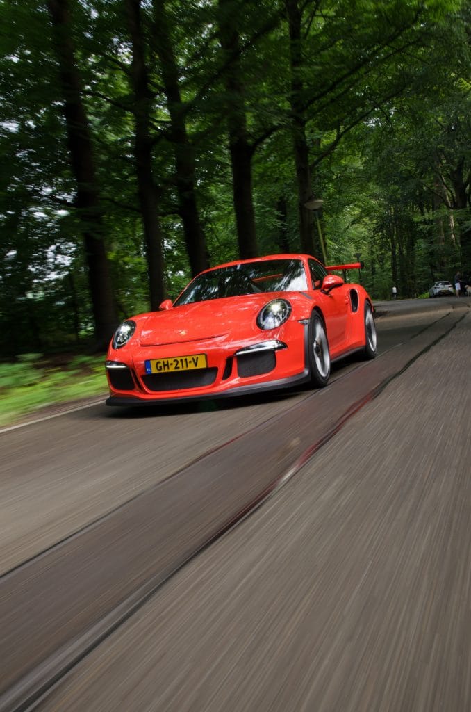Maar dan opent de weg zich. Bij een druk op eerdergenoemde knop openen enkele kleppen in het uitlaattraject en zodra de motor op toeren komt, overdondert de GT3 RS je met een geluid dat de trommelvliezen doet scheuren. Het gaspedaal gaat diep naar de vloer en zodra de naald de 4.500 toeren passeert, schiet de auto ervandoor. Mijn adem stokt en mijn blikveld vernauwt zich tot een smalle koker. Het gemak waarmee de auto stappen maakt is bizar, maar de GT3 RS vraagt wel van je dat je hem hoog in de toeren houdt. Onder de 4.000 toeren per minuut lijkt de GT3 RS nauwelijks sneller dan een ordinair GTI’tje. Gelukkig heb je dan nog een hele weg te gaan tot de schaal van de toerenteller bij 8.800 toeren rood wordt. Het zijn vooral de laatste paar honderd toeren die bijzonder zijn. Net als je denkt dat het feestje voorbij is en je moet opschakelen, gooit de auto er nog een schepje bovenop. Opvallend is wel dat de RS-motor het laatste spectaculaire snerpje van de ‘gewone’ GT3 mist. Die motor klinkt vlak voordat de toerenbegrenzer ingrijpt alsof een deel van het uitlaatsysteem los laat. Echt kippenvelopwekkend. De GT3 RS mist dat laatste sensationele stukje – wellicht doordat ‘ie ook net iets minder toeren maakt dan de ‘standaard’ GT3. Namelijk 9.000 tegenover 8.800 toeren. Het is vermoedelijk gedaan om de levensduur te verlengen, maar het komt wel een beetje raar over dat de minder hardcore GT3 een ruigere – of althans: ruiger klinkende – motor heeft dan zijn RS-evenknie.
