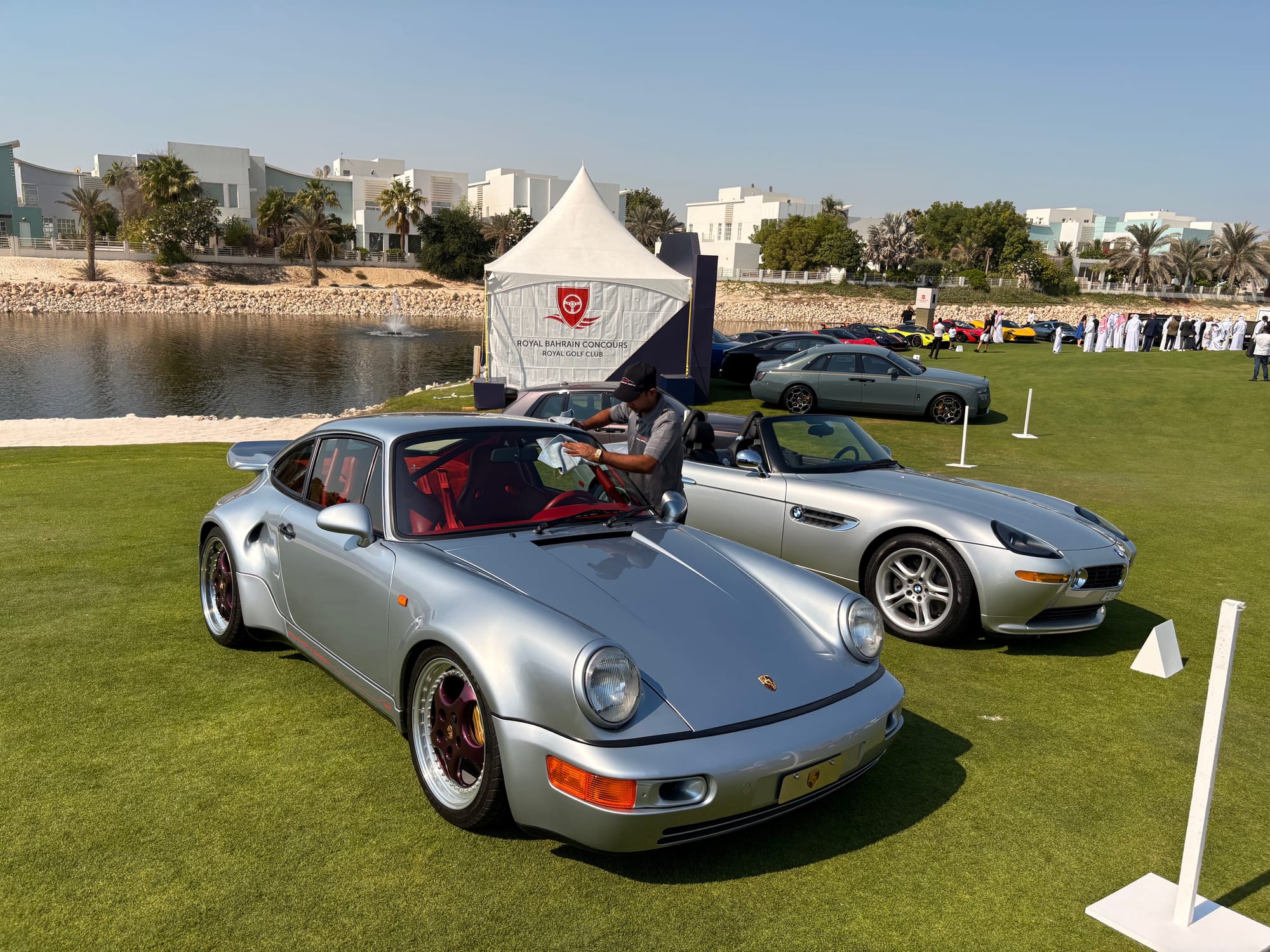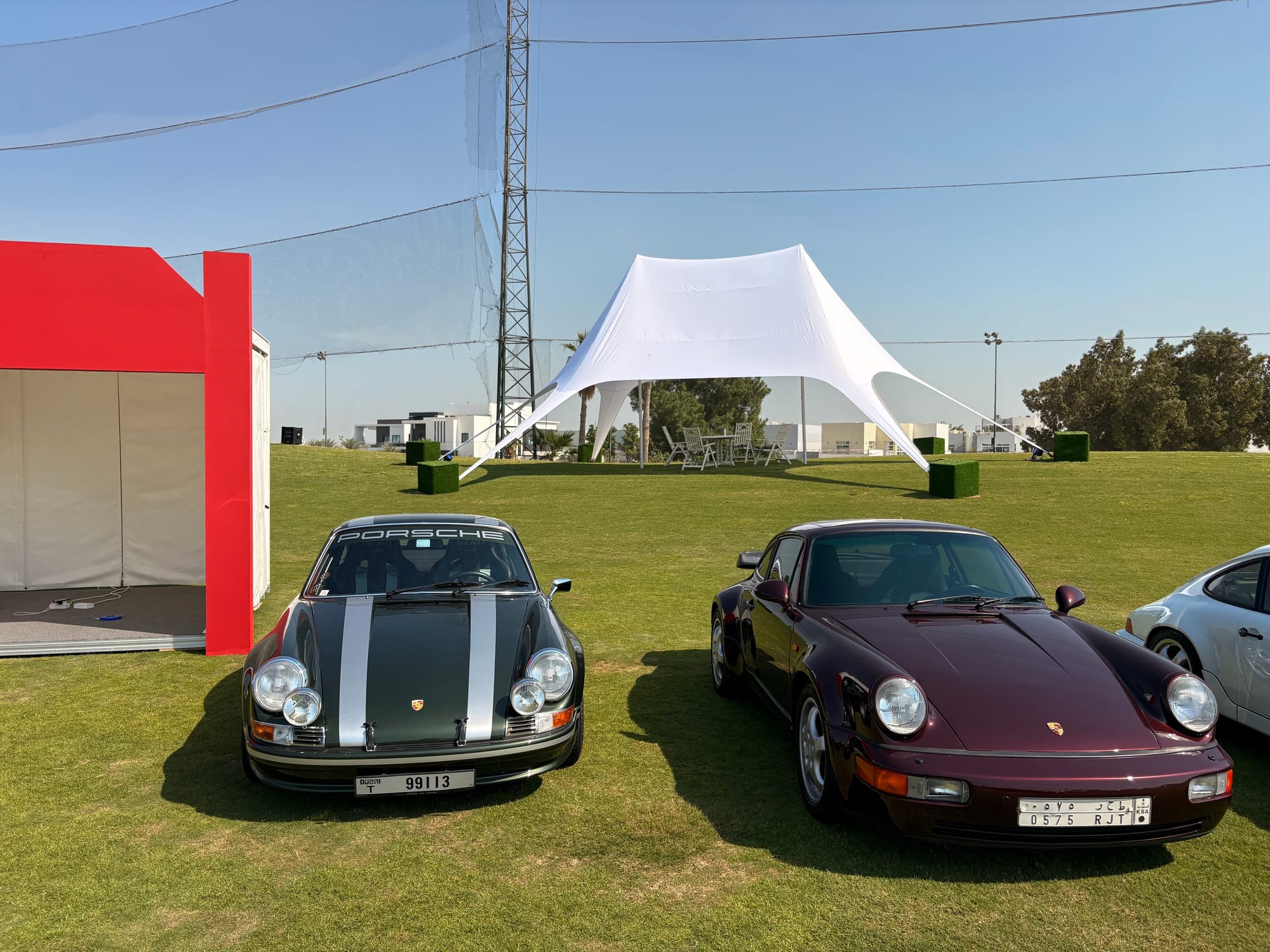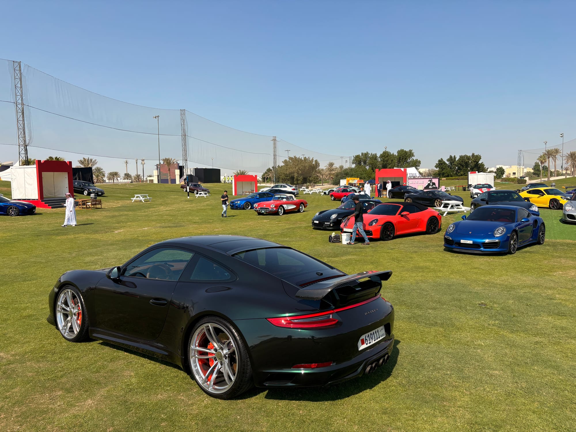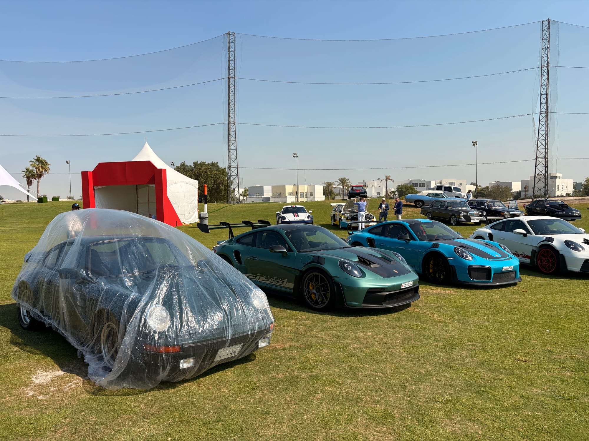 Langs de wegen vanaf het vliegveld en de uitvalswegen vanuit Manama hadden we al de nodige affiches ter aankondiging van het evenement gezien, waarbij er op het affiche met het motto “Class and craftsmanship” een oudere 911 te zien was en het affiche “Refined Elegance” een recentere 911 GT3 RS toonde. Dat beloofde al wat. Eenmaal bij het terrein aangekomen was het op het uur van de opening al flink druk. De toegezegde perskaart was per email verzonden en na het scannen van de bijbehorende QR-code kregen we een bandje voor de toegang. De auto’s op het gras van de golfbaan boden een fraaie aanblik.