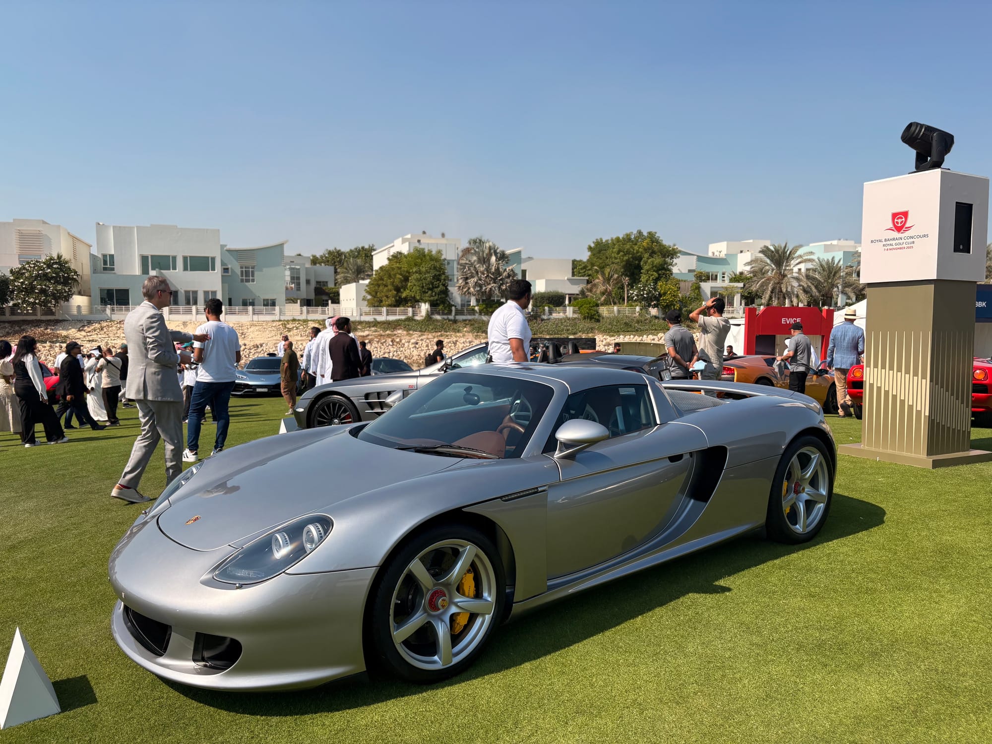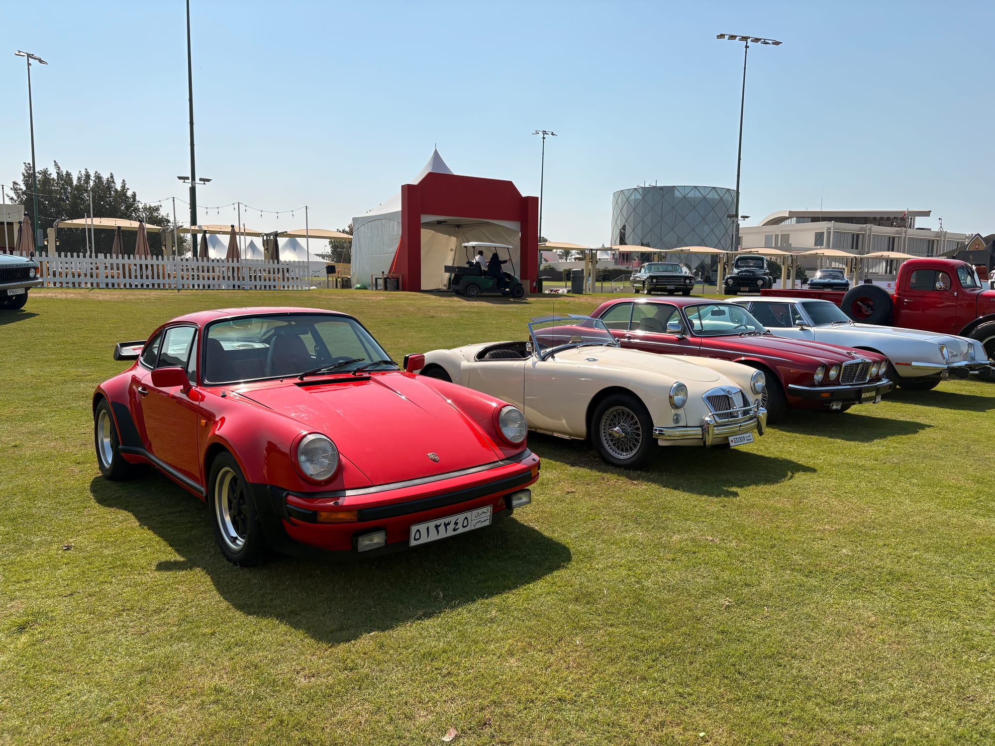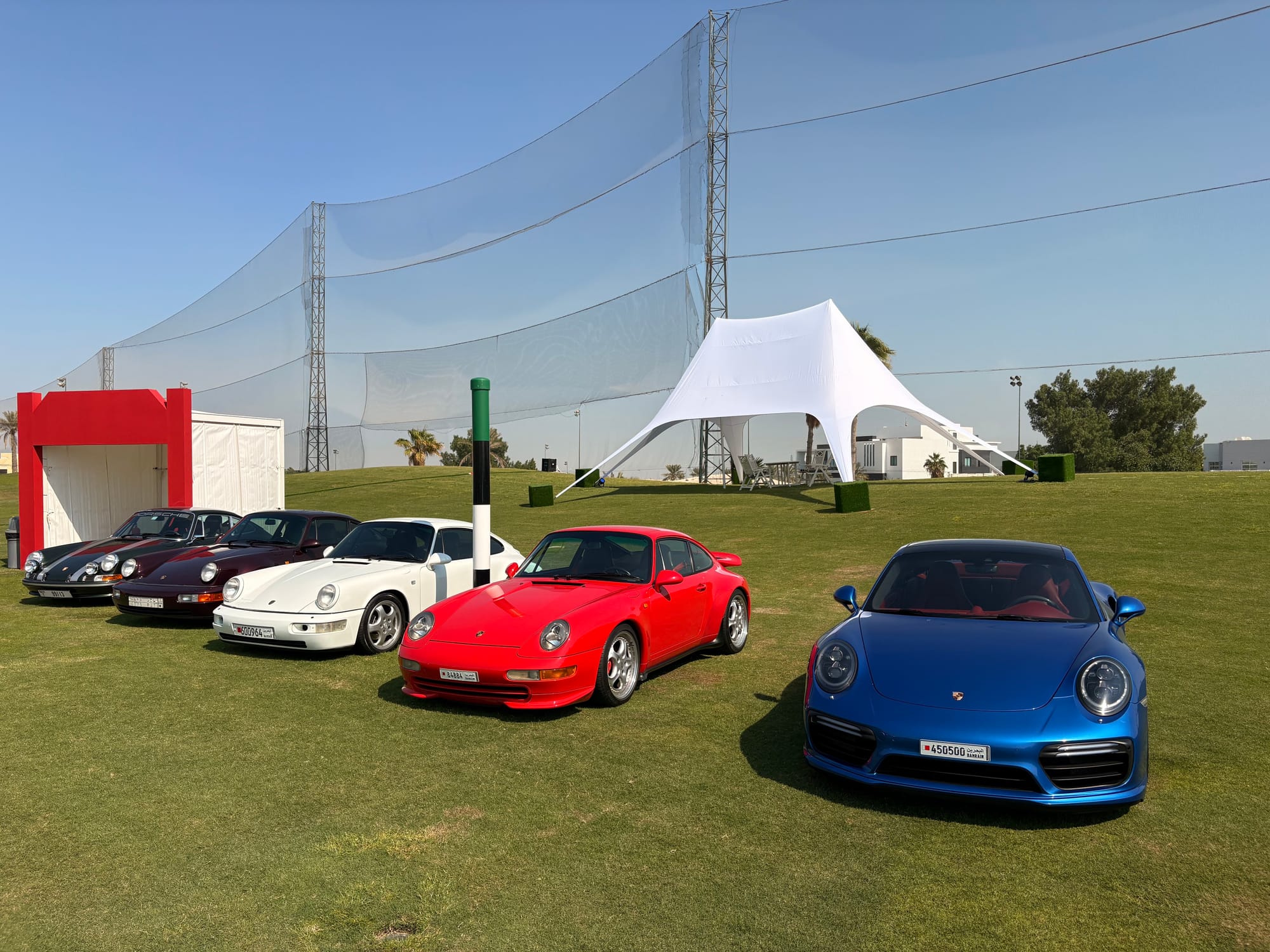 Langs de wegen vanaf het vliegveld en de uitvalswegen vanuit Manama hadden we al de nodige affiches ter aankondiging van het evenement gezien, waarbij er op het affiche met het motto “Class and craftsmanship” een oudere 911 te zien was en het affiche “Refined Elegance” een recentere 911 GT3 RS toonde. Dat beloofde al wat. Eenmaal bij het terrein aangekomen was het op het uur van de opening al flink druk. De toegezegde perskaart was per email verzonden en na het scannen van de bijbehorende QR-code kregen we een bandje voor de toegang. De auto’s op het gras van de golfbaan boden een fraaie aanblik.
