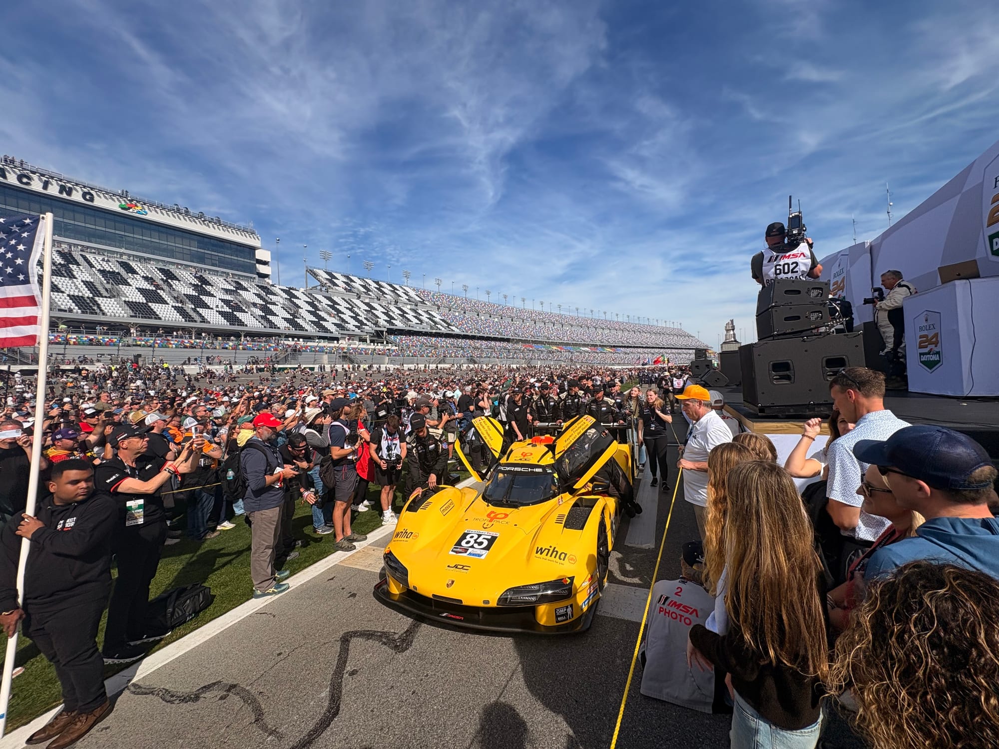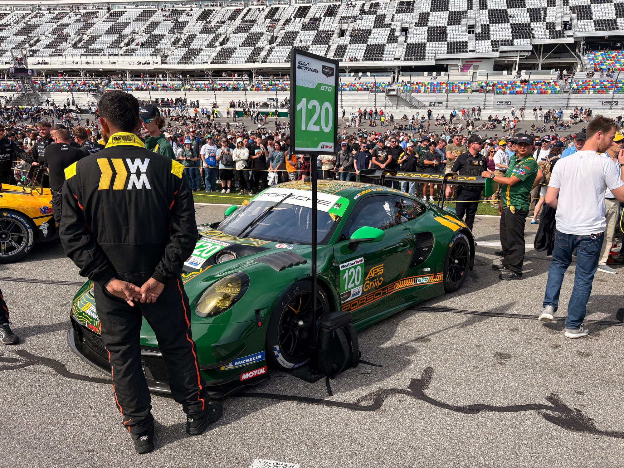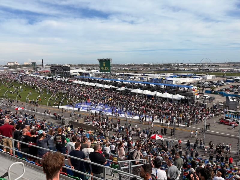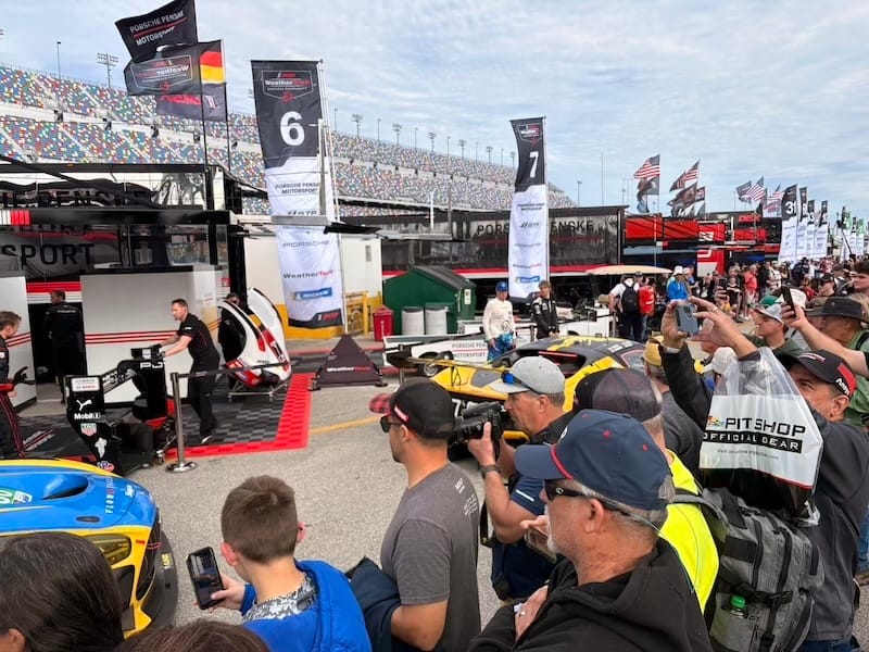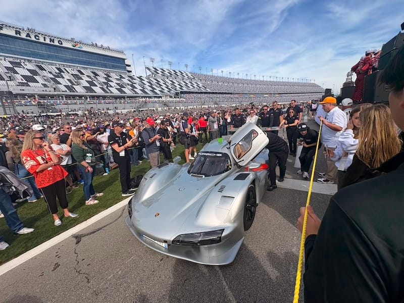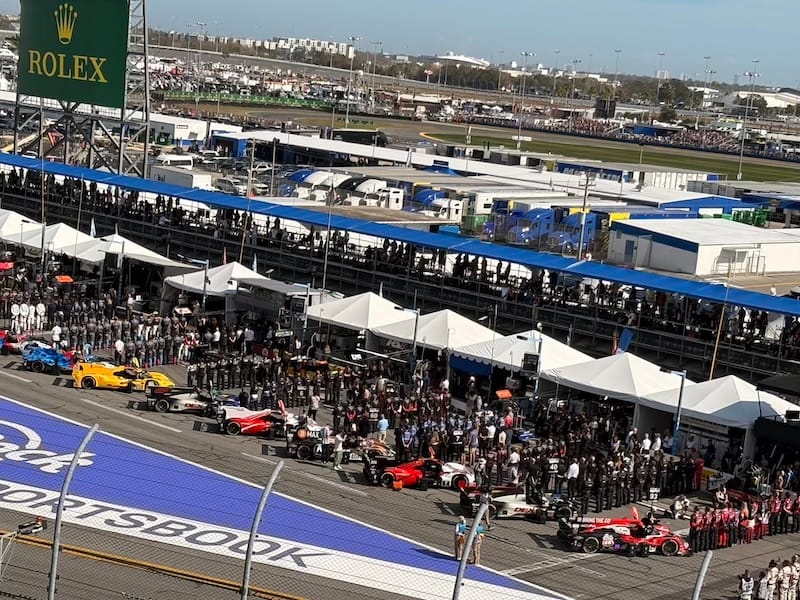 Na een interview met IMSA-president John Doonan, met wie het altijd zeer prettig spreken is, was het tijd voor de rijdersintroducties voorafgaand aan de race. Een voor een werden de 60 deelnemende auto’s naar hun posities op de grid geduwd, terwijl de betreffende rijders op het podium met naam en toenaam gepresenteerd en in sommige gevallen kort geïnterviewd werden. Een mooie show met vlaggen van alle betrokken rijders rondom de auto’s en ook de Porsche 963 RSP, de straatversie van de Porsche-raceauto, speciaal gebouwd voor Roger Penske, werd zo gepresenteerd. Het was een enorme drukte op de startopstelling, waar bij IMSA-races alle bezoekers vrij toegang hebben. Het verliep als altijd zeer gedisciplineerd, er werd geen wanklank gehoord en binnen korte tijd was het circuit ook weer vrij voor de start van de race.