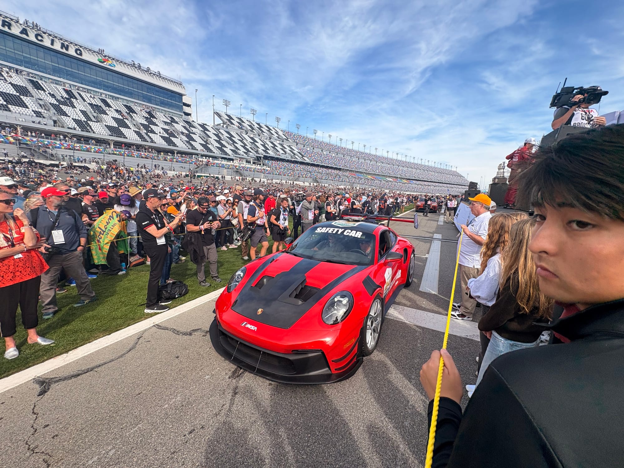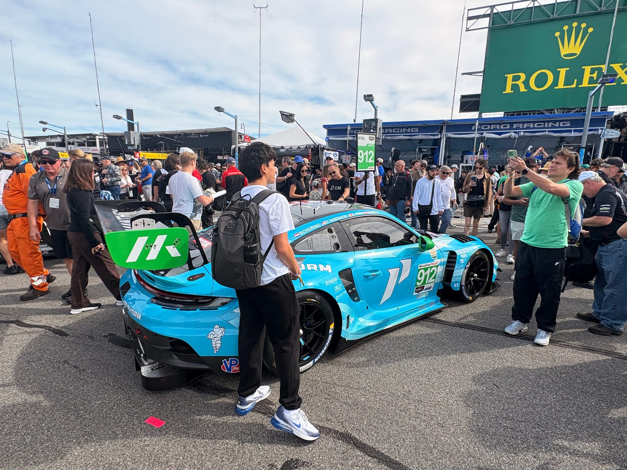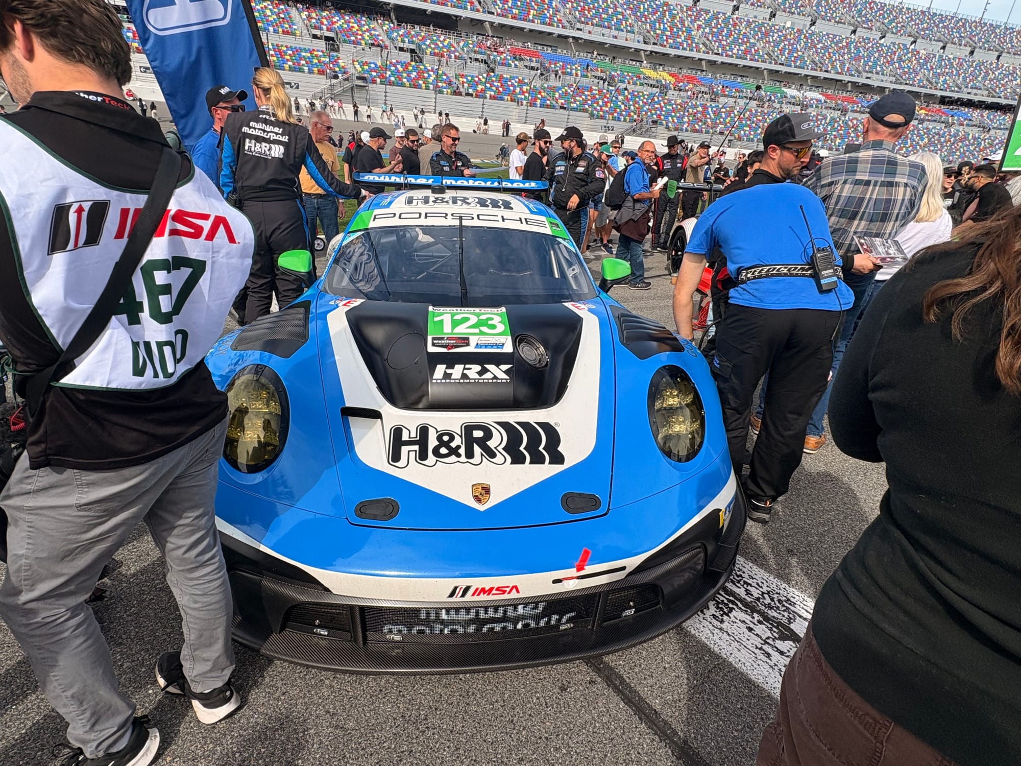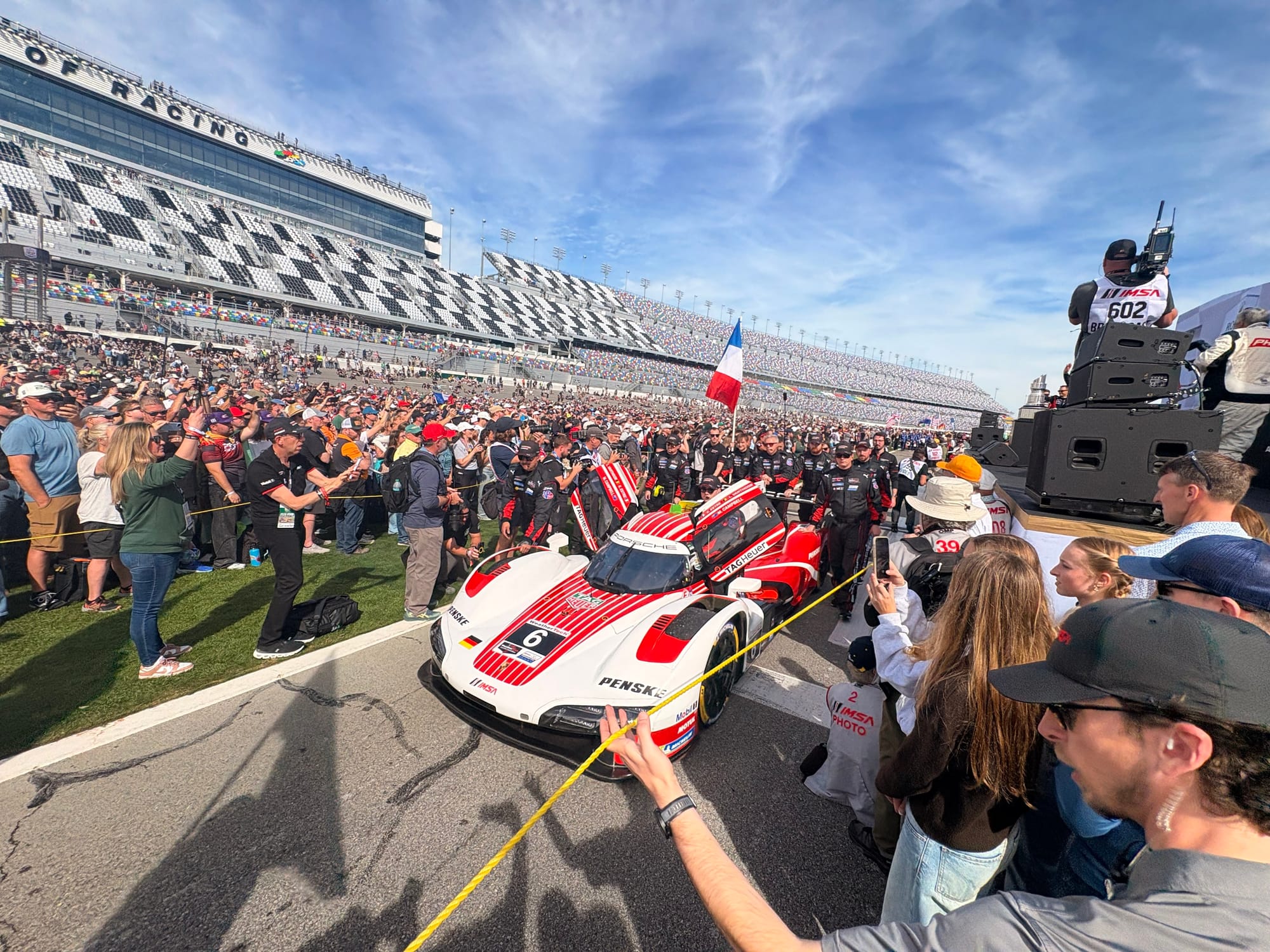 Na een interview met IMSA-president John Doonan, met wie het altijd zeer prettig spreken is, was het tijd voor de rijdersintroducties voorafgaand aan de race. Een voor een werden de 60 deelnemende auto’s naar hun posities op de grid geduwd, terwijl de betreffende rijders op het podium met naam en toenaam gepresenteerd en in sommige gevallen kort geïnterviewd werden. Een mooie show met vlaggen van alle betrokken rijders rondom de auto’s en ook de Porsche 963 RSP, de straatversie van de Porsche-raceauto, speciaal gebouwd voor Roger Penske, werd zo gepresenteerd. Het was een enorme drukte op de startopstelling, waar bij IMSA-races alle bezoekers vrij toegang hebben. Het verliep als altijd zeer gedisciplineerd, er werd geen wanklank gehoord en binnen korte tijd was het circuit ook weer vrij voor de start van de race.