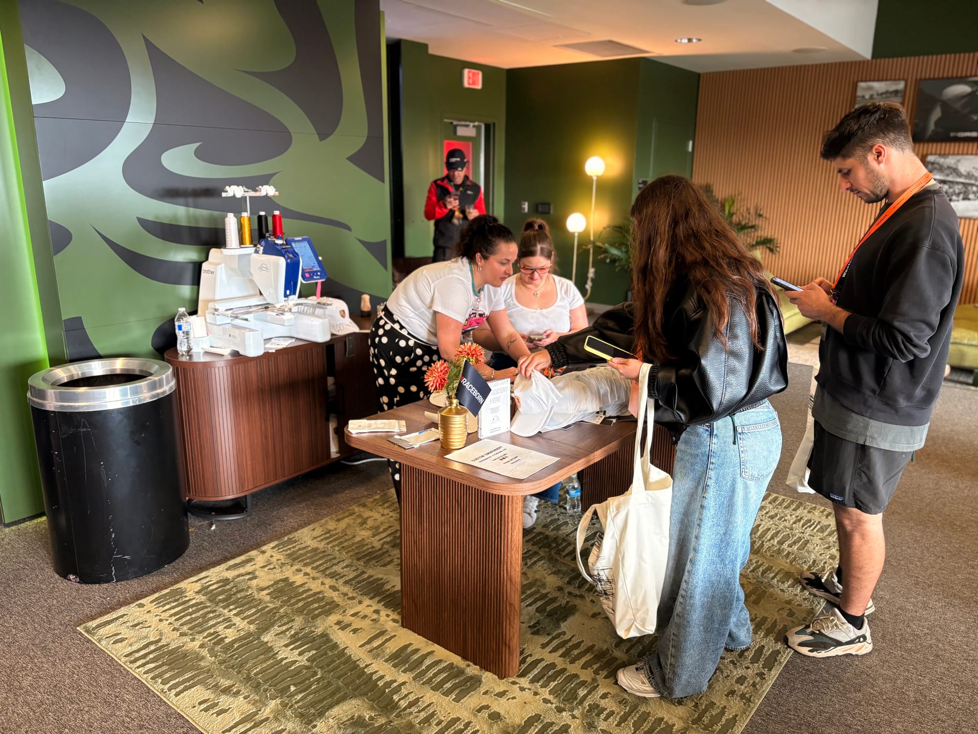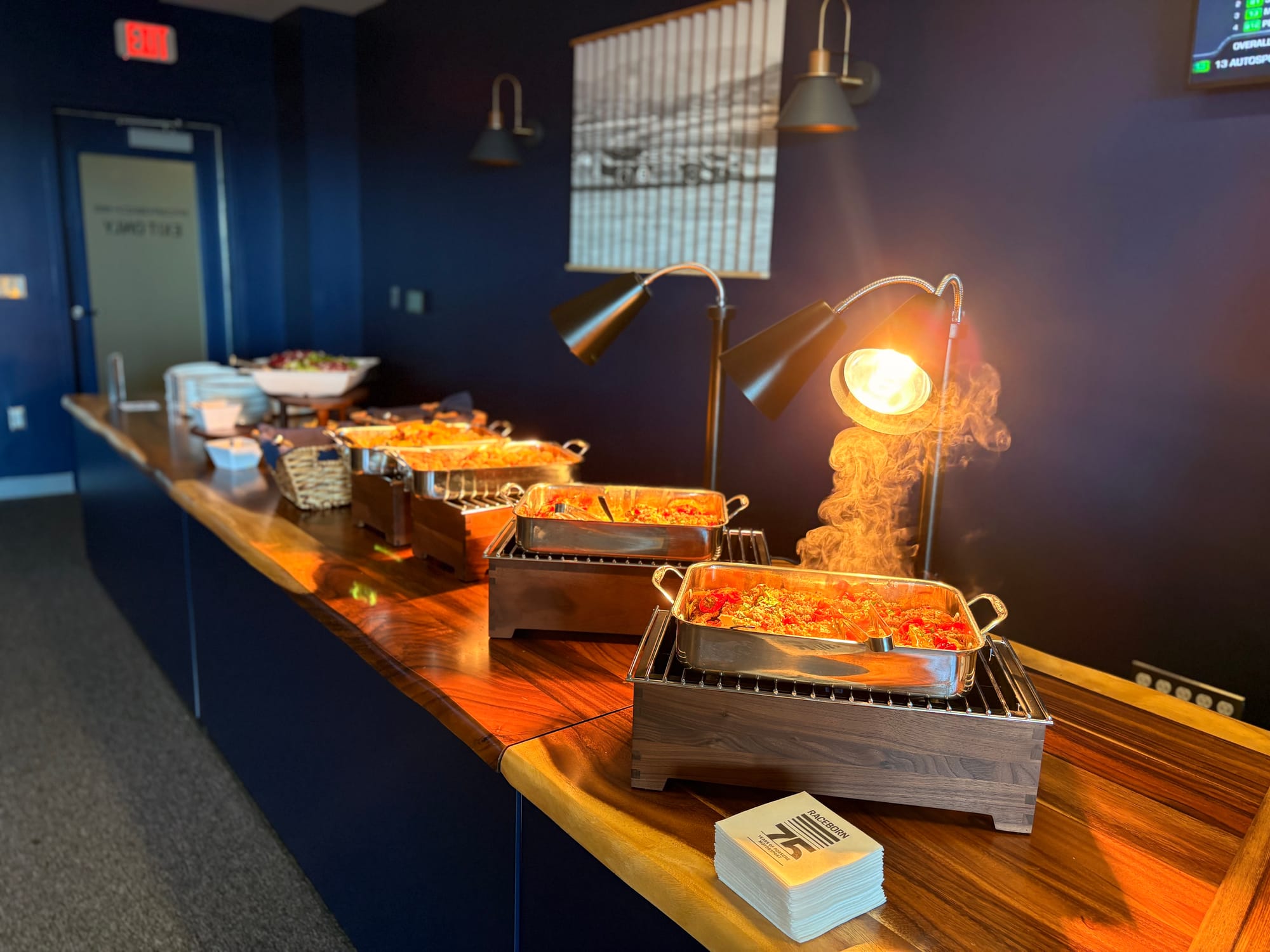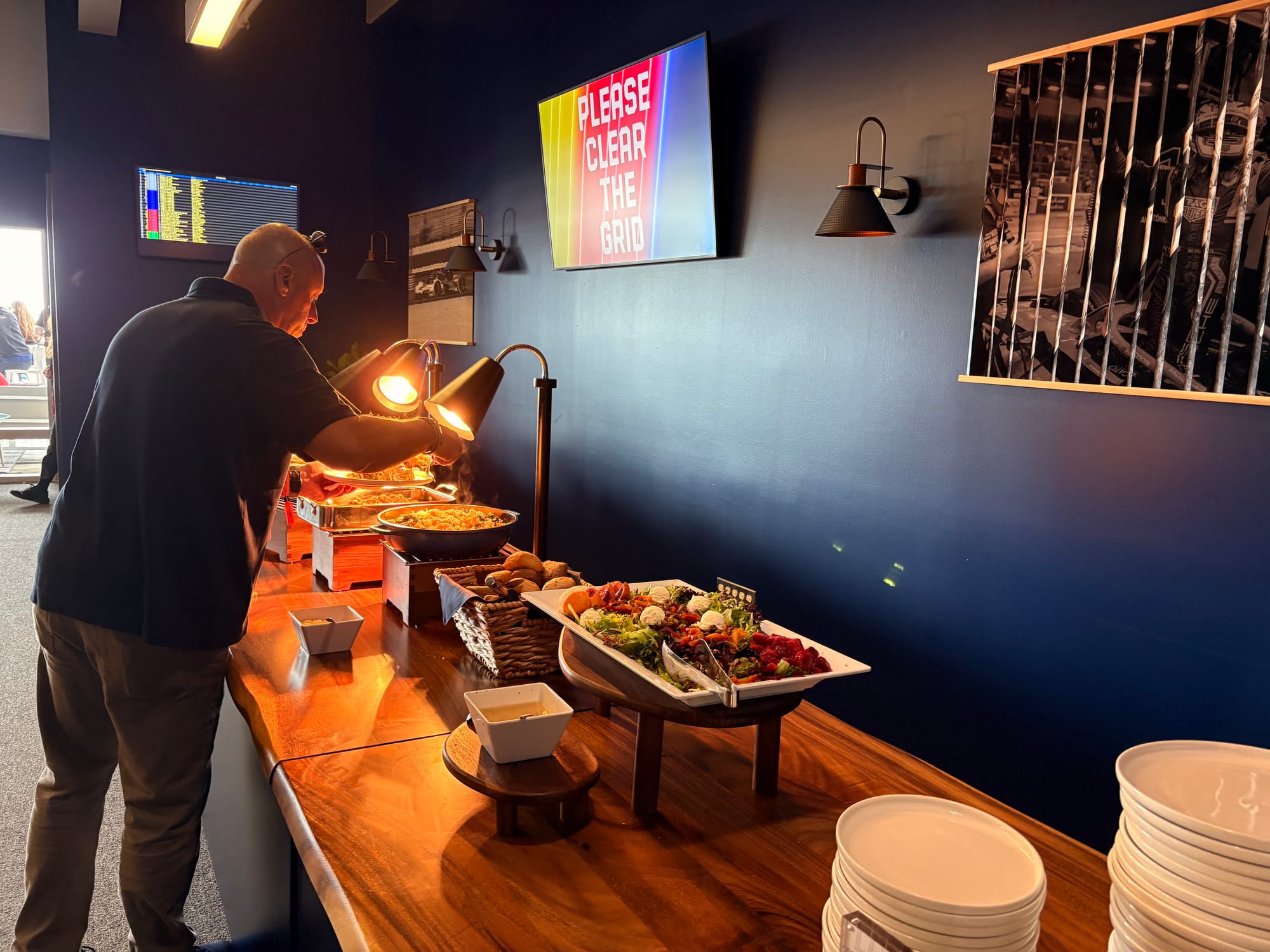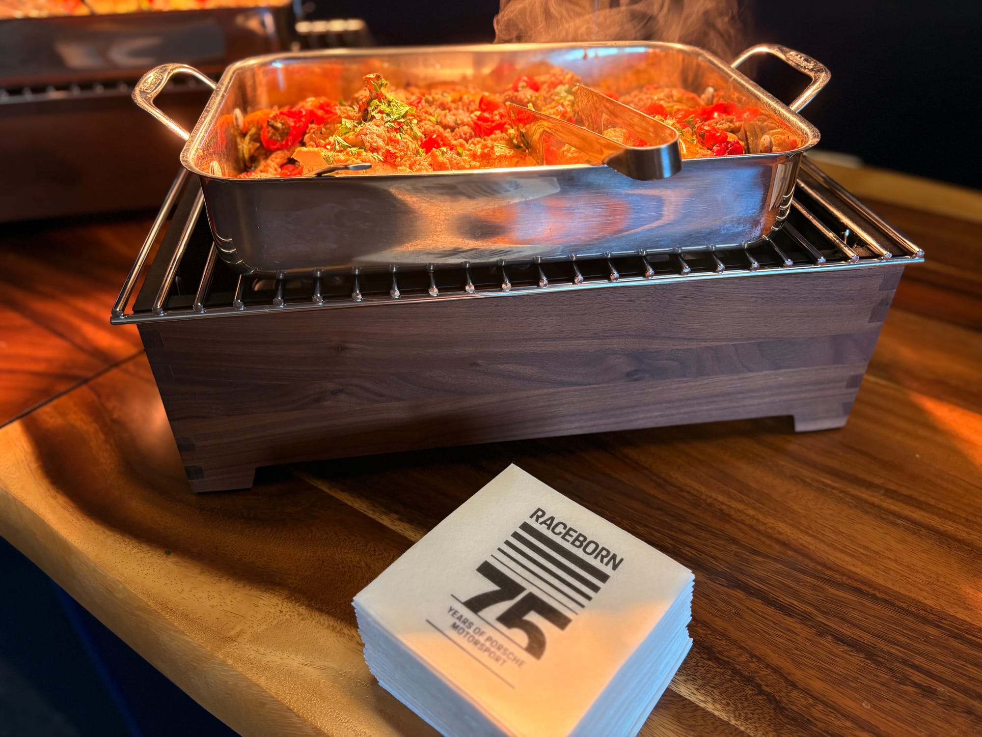 Ik was ook via de steile banking en het enorme tribunecomplex naar de overkant van de baan gegaan, waar ik de laatste aanloop naar de race en de start wilde volgen vanaf het balkon van de Porsche-hospitality. Die hospitality, officieel aangeduid als ‘Porsche Racehaus’, bevond zich evenals in voorgaande jaren op de eerste ring van zogeheten ‘suites’ in het gebouw van de hoofdtribune. Naast meerdere ‘suites’ behoorden ook een gereserveerd tribunegedeelte en een riant terras tot de accommodatie. In een van de ruimten was een enorm beeldscherm voor de uitzending van de race en een iets kleiner scherm voor de tijdwaarneming aangebracht. Vanuit de comfortabele lounge-stoelen was het raceverloop zo perfect te volgen. In een andere ruimte bevonden zich een koffiebar en meerdere zitgelegenheden, de volgende ruimte was de plek waar aan weerszijden op meerdere momenten van de dag identieke buffetten werden opgebouwd voor versterking van de inwendige mens en in de laatste ruimte was naast een bar ook een goed gevulde merchandise-shop te vinden. Hier konden bezoekers ook een Porsche-cap van hun initialen en een of meerdere gestikte patches laten voorzien. Ook aan posters als leuke souvenirs van het evenement was gedacht.