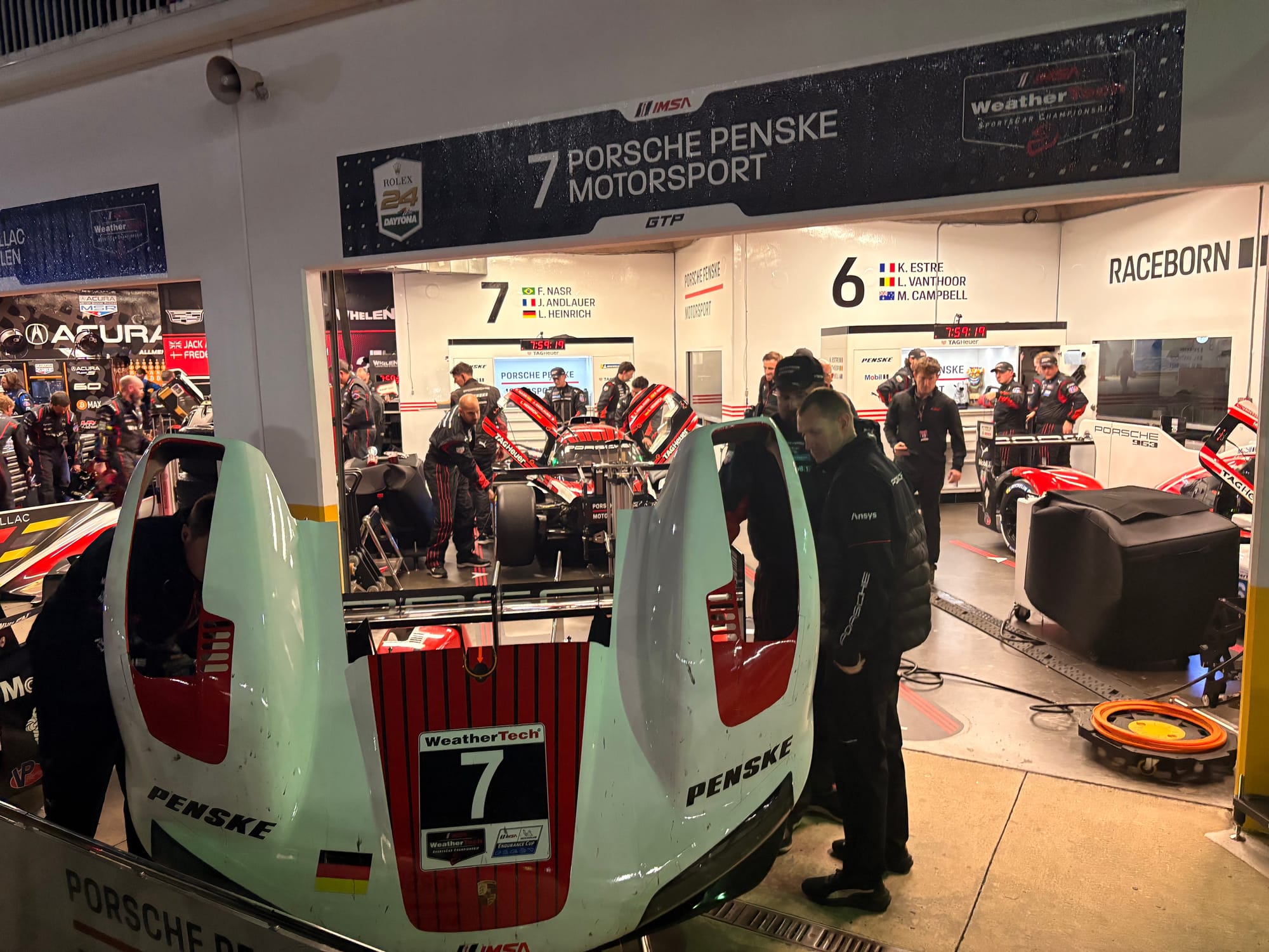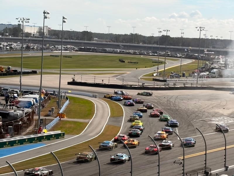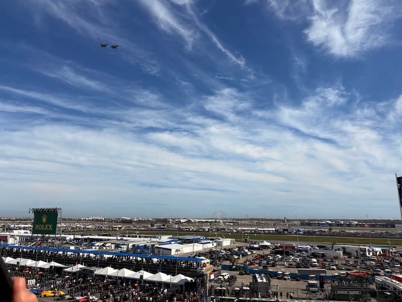 De ceremonie voorafgaand aan de start van de race was als altijd indrukwekkend. Nadat alle bezoekers de startopstelling hadden verlaten, waren er alleen nog de auto’s en de bijbehorende teams, strak opgesteld in slagorde. Kinderen van een schoolklas zeiden de eed van trouw aan de Amerikaanse vlag op, een voorganger bad om de zegen van boven en bescherming voor de rijders en teams, een zangeres vertolkte het Amerikaanse volkslied en op de seconde nauwkeurig vlogen bij de laatste maten van de “Star-spangled banner” twee straaljagers over het circuit. Natuurlijk, we hadden vorig jaar ook een schitterende show van de Koninklijke Luchtmacht met straaljagers boven Zandvoort voor de Nederlandse Formule 1-Grand Prix, maar in Amerika doen ze het nog allemaal net even indrukwekkender. Golfster Lexi Thompson sprak het commando “Drivers, start your engines”, waarna het veld werd losgelaten voor twee ronden achter de safety-car, een rode Porsche 911 GT3 R met Manthey-kit. De eerste ronde reed ook Timo Bernhard met de zilvergrijze Porsche 963 RSP voor het veld uit, een fraaie aanblik.