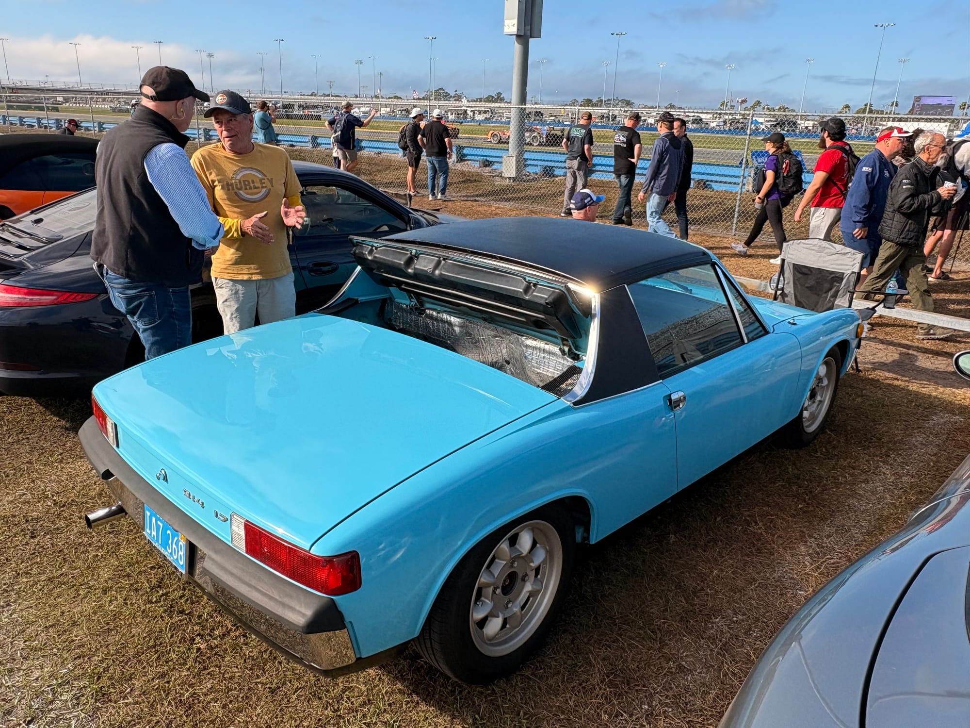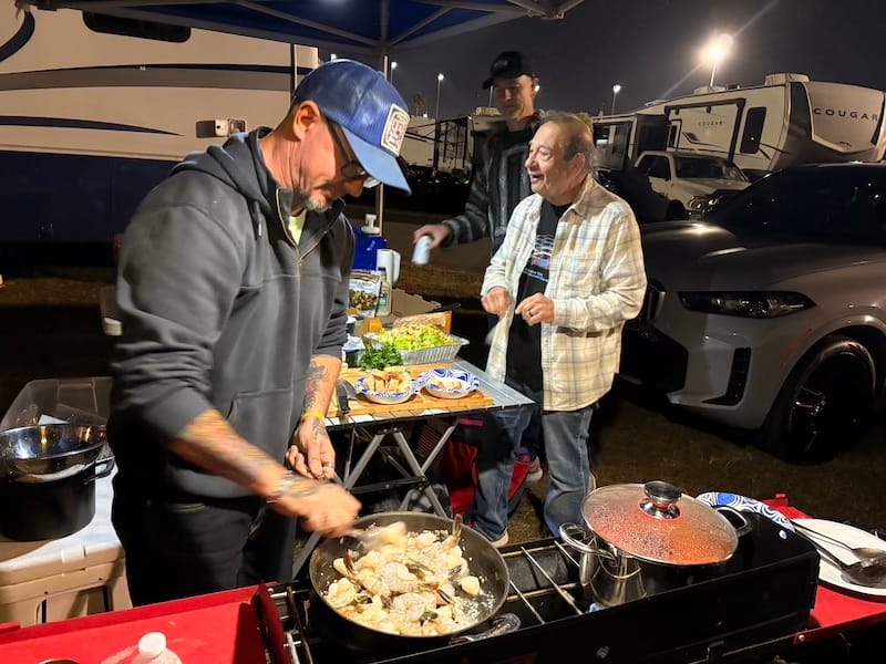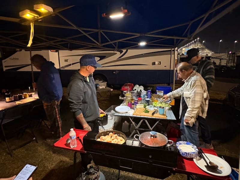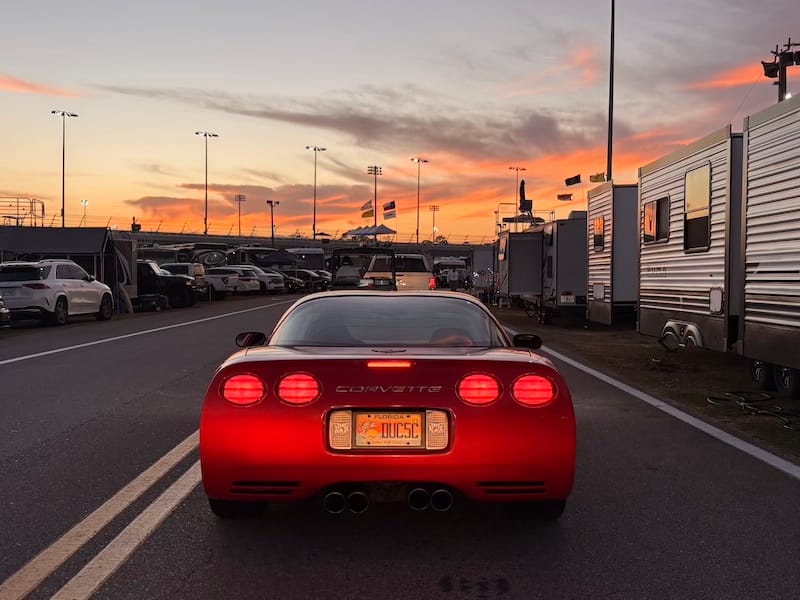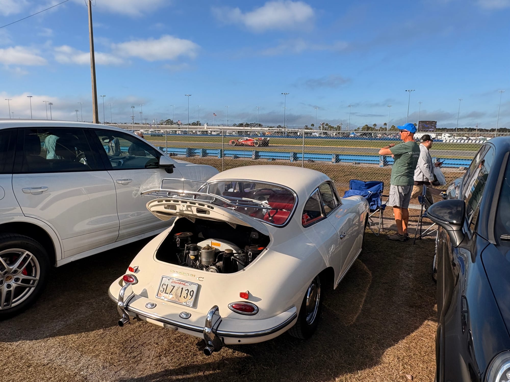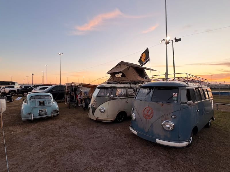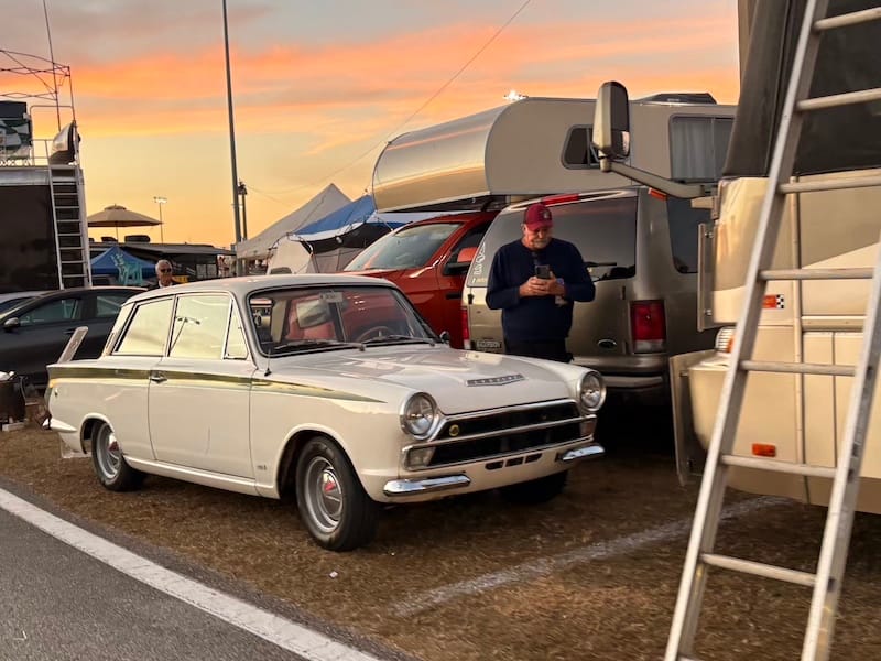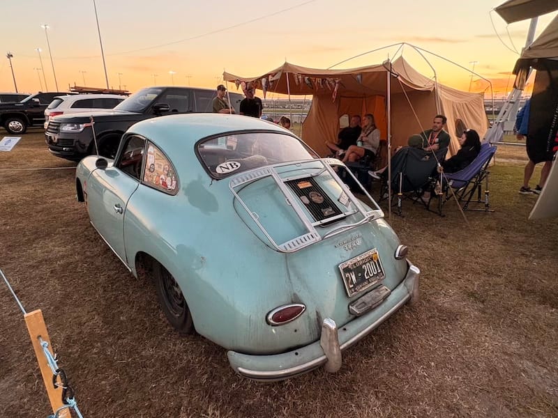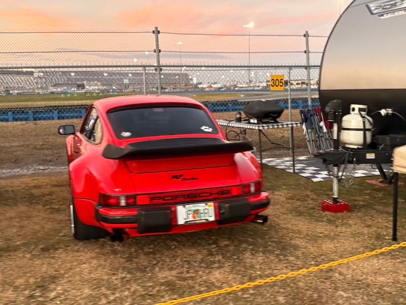 De avond bracht ik door bij een groep Amerikaanse vrienden die al jarenlang vaste bezoekers in Daytona en bij diverse andere races zijn. Een aantal van hen heeft een restaurant-achtergrond, dus onnodig te zeggen dat er ook op het kampeerterrein van het circuit voortreffelijk gekookt wordt. Het werd een bijzonder genoeglijke avond met heerlijk eten en fijne gesprekken. Autosport verbindt mensen over alle grenzen heen. Onderweg naar hun plek op het circuitterrein aan de buitenkant van Turn 1 spotte ik ook nog de nodige interessante auto’s. Absoluut hoogtepunt natuurlijk de 356 vol patina, die ieder jaar in Daytona te vinden is, omringd door de nodige Volkswagenbusjes. Ook een Ford Lotus Cortina, een Porsche 911 Turbo en een Ferrari 308 waren leuk.