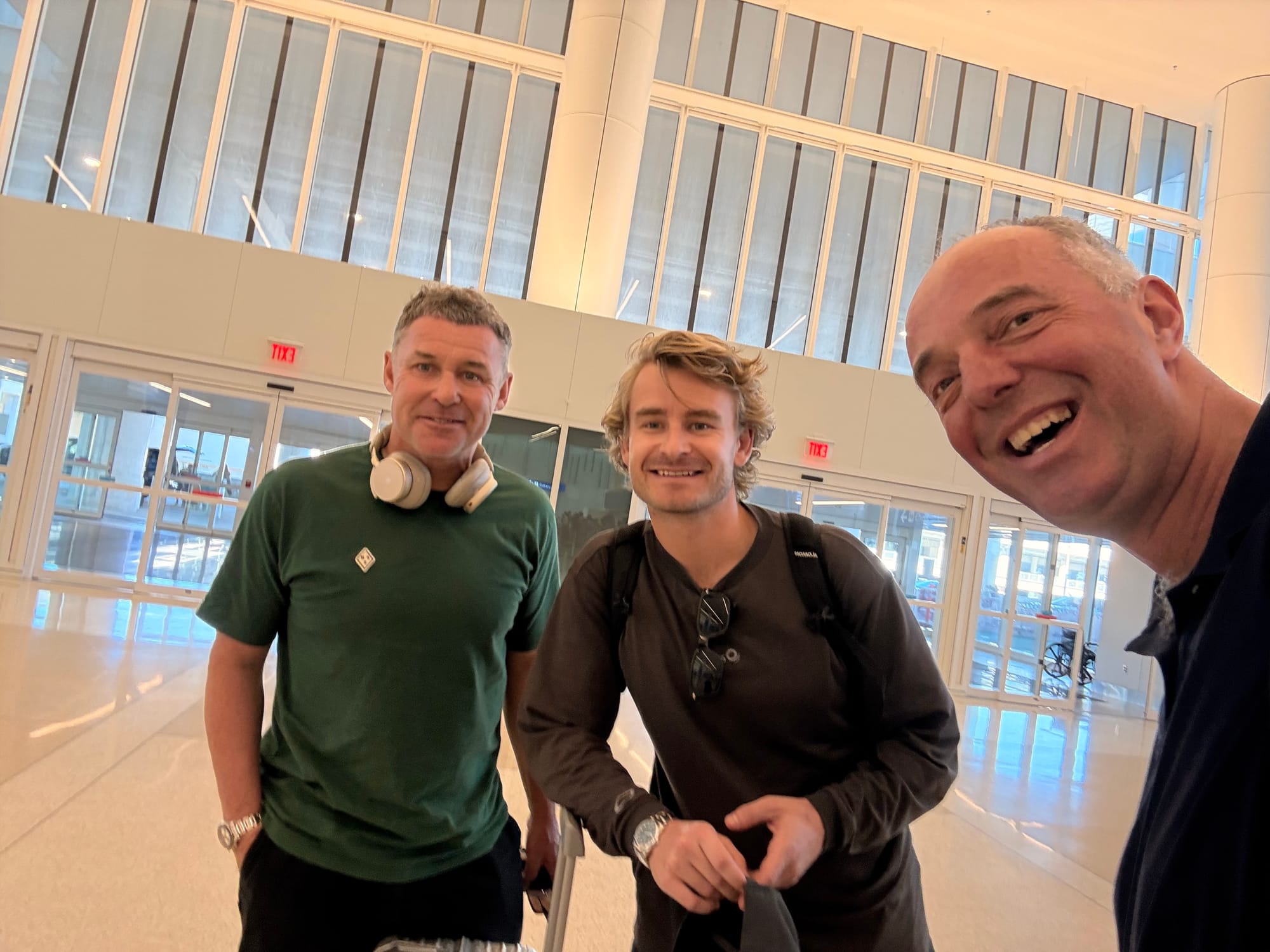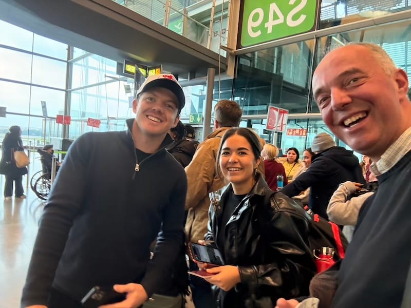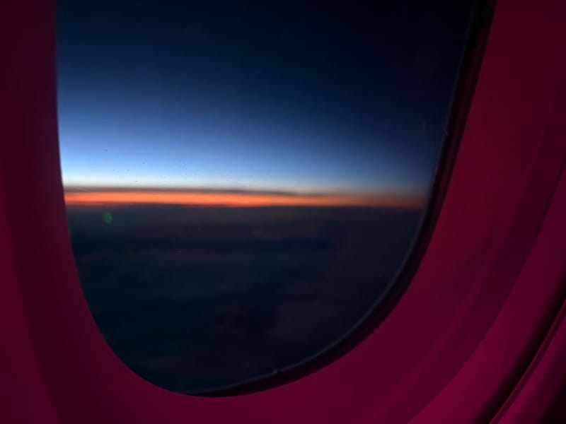 Zonsopkomst in het vliegtuig, Spaanse lekkernijen in de Iberia-lounge, ontmoeting met Formule E- en sportwagencoureur Nick Cassidy op het vliegveld in Madrid en Formule 1-film aan boord.