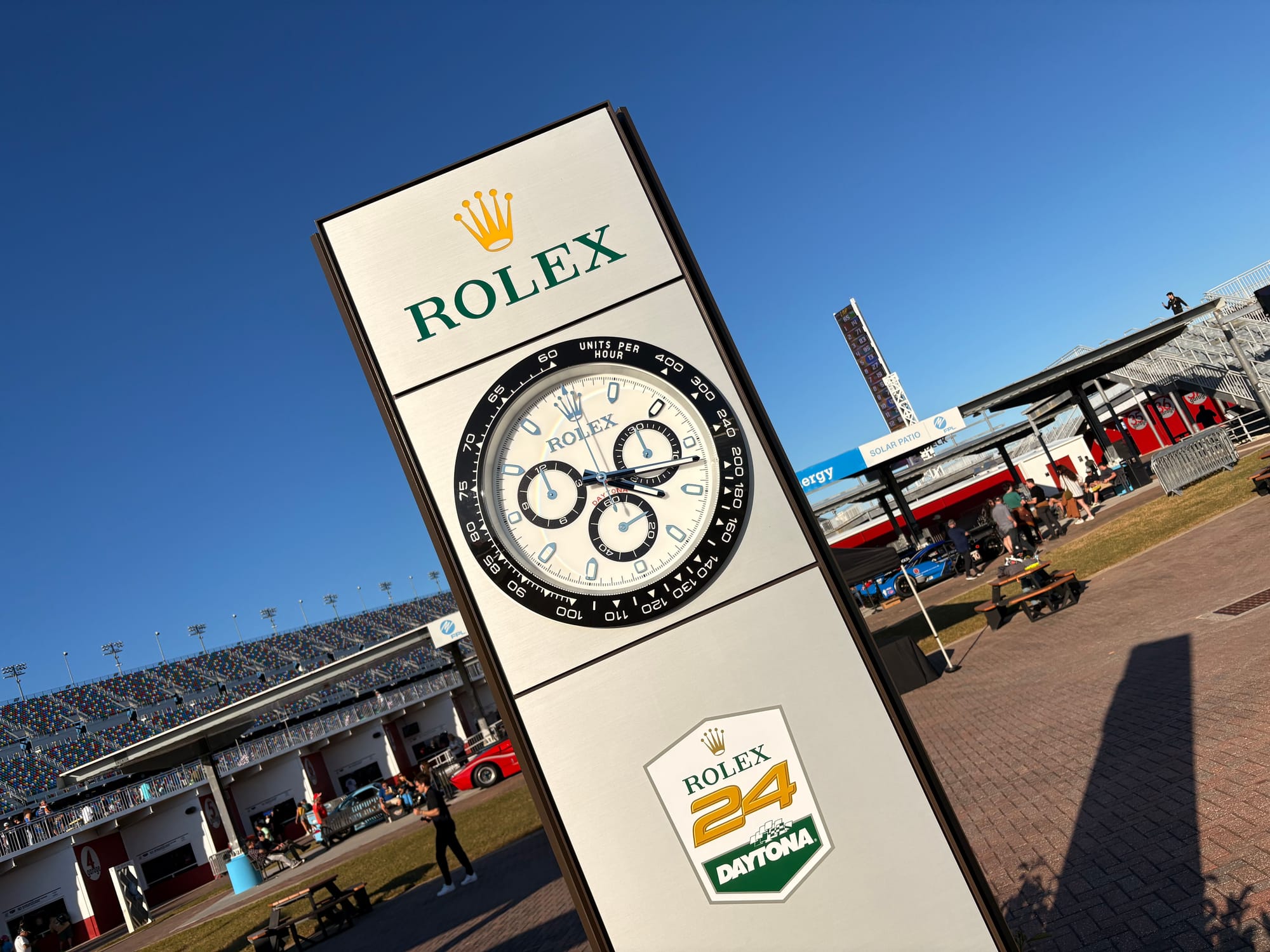 Wakker worden met de zon boven de oceaan, de beroemde Rolex-zuil, volop drukte op het circuit overdag en in de avond, interview met de beide Nederlandse Porsche-coureurs Van der Helm en Schuring, Rolex-receptie.