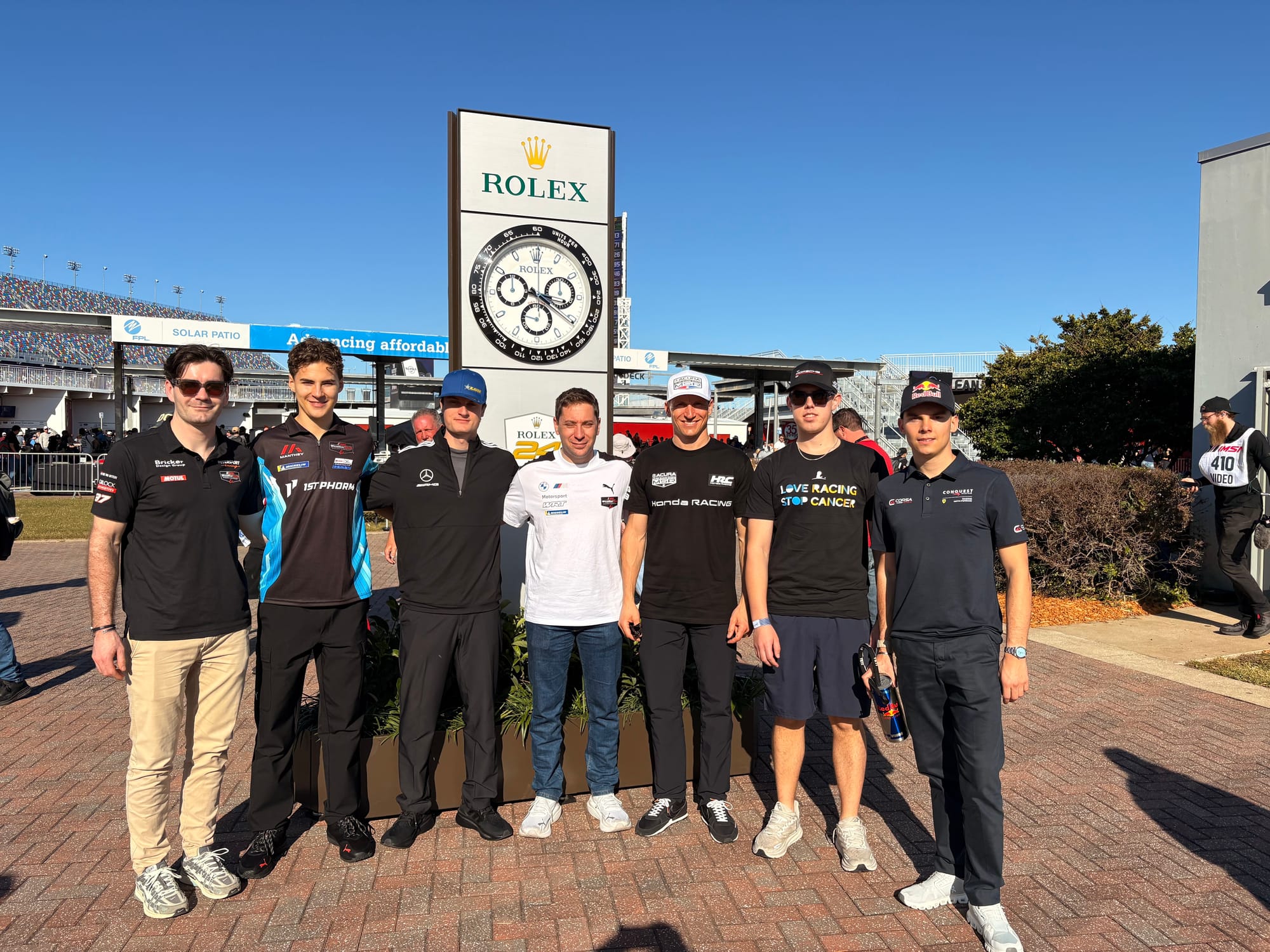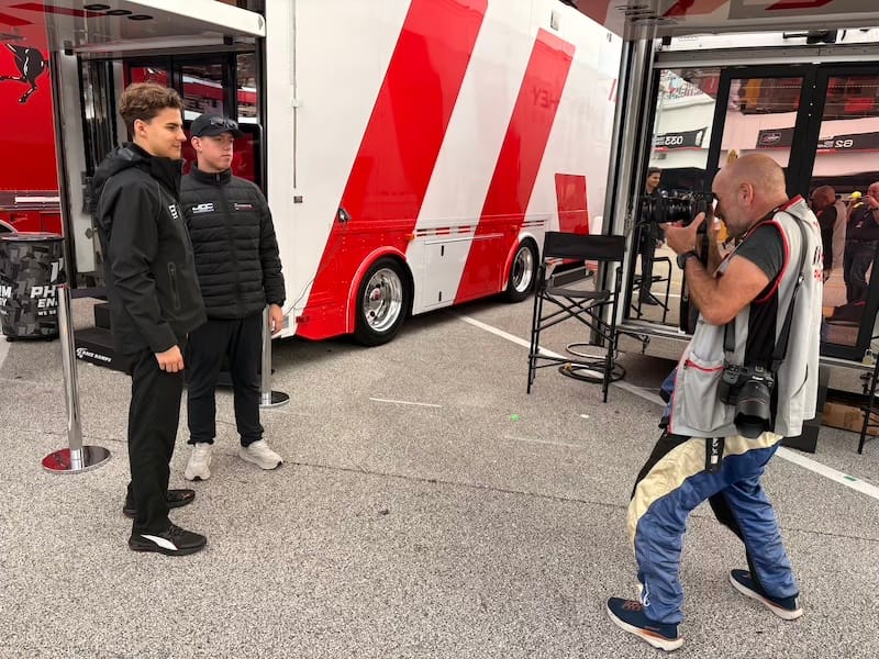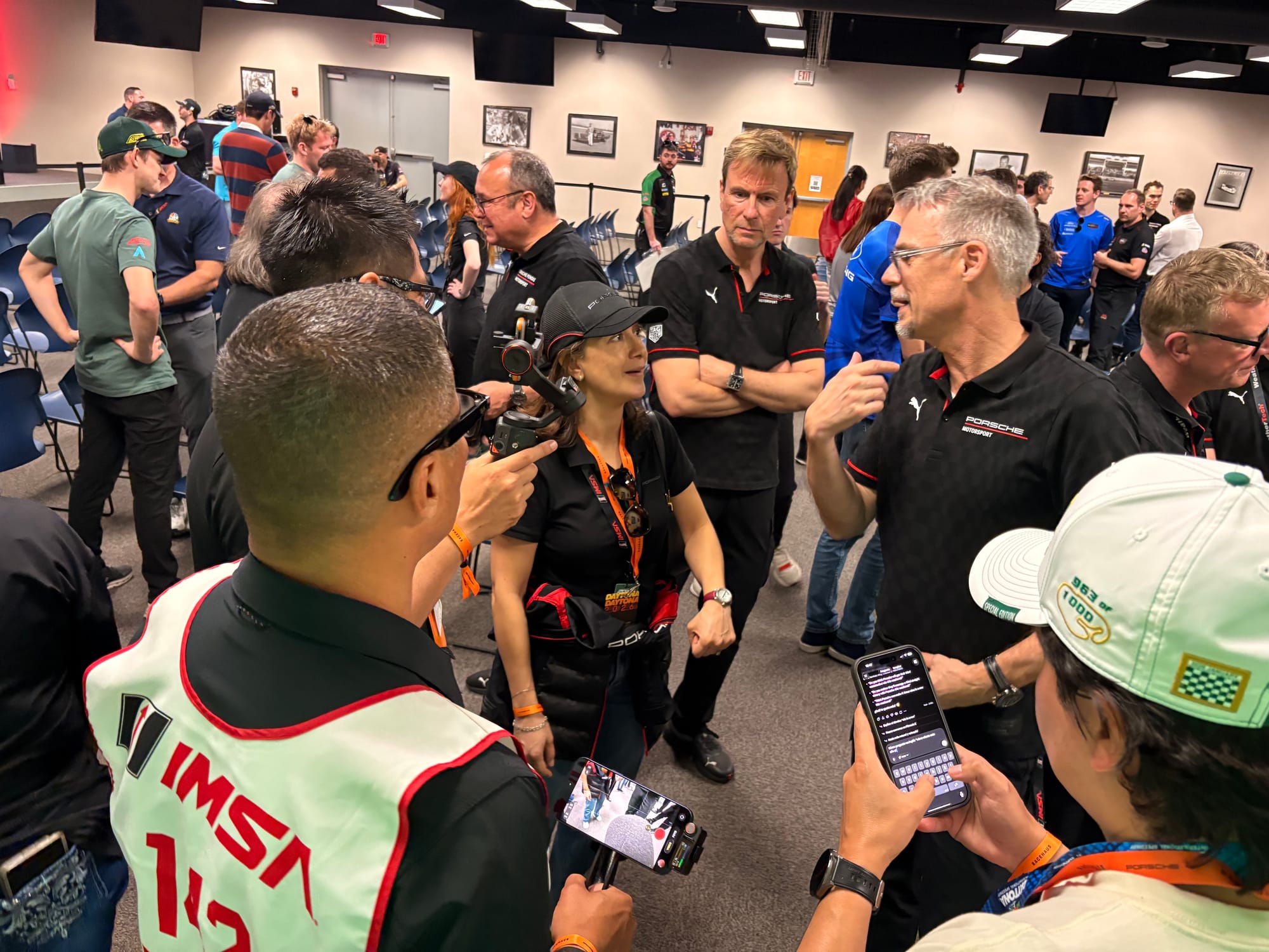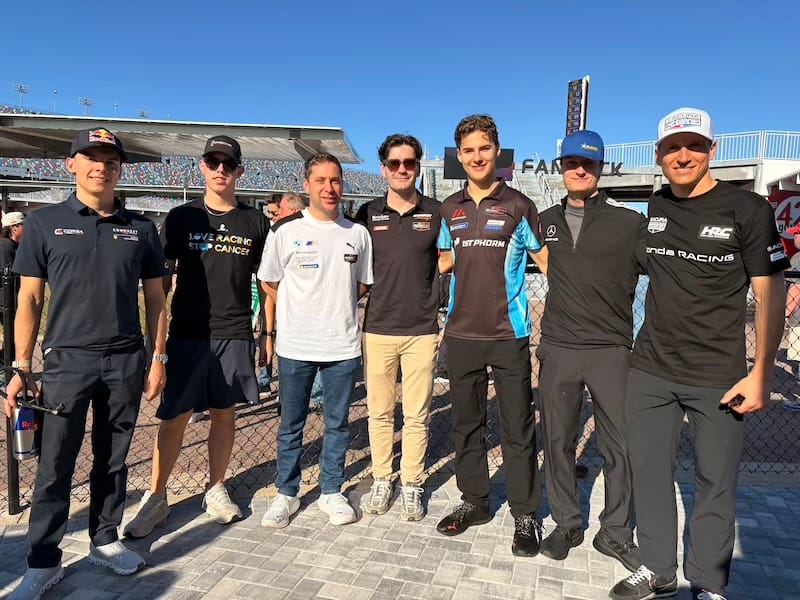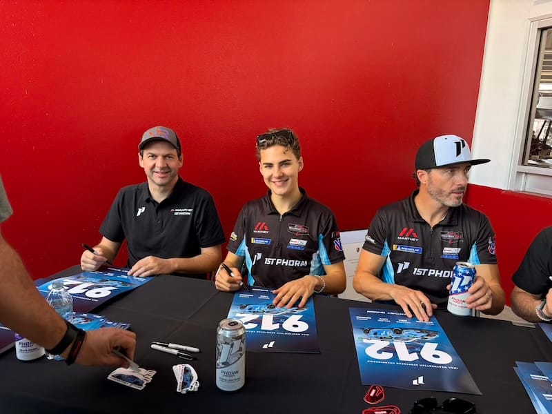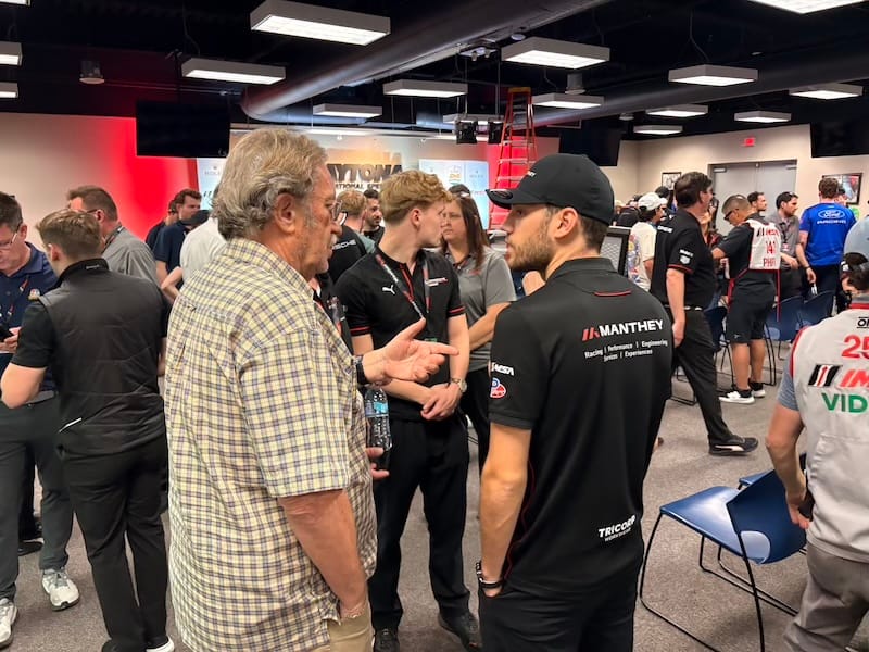 Na deze excursie was het weer tijd voor het circuit voor de derde en afsluitende vrije training, gevolgd door de vier-uursrace van de IMSA Michelin Pilot Challenge, de tweede divisie in de Amerikaanse sportwagens met GT4’s en TCR-toerwagens. Tijdens die race vond ook de grote handtekeningsessie met alle deelnemers aan de 24-uursrace plaats, wat een goede gelegenheid was om even bij te praten met coureurs die ik nog niet eerder had gezien. Aansluitend aan de handtekeningsessie had ik zoals ieder jaar een groepsfoto gepland met alle negen de Nederlandse rijders voor mijn publicaties Autosport.nl en Start’84. Via de WhatsApp-groep die ik met al die coureurs onderhoud, had ik het meerdere malen aangekondigd en de meesten had ik er tijdens de handtekeningsessie ook nog een keer aan herinnerd, maar toch ontbraken er twee op het afgesproken tijdstip. De ene was het vergeten en bij de andere liep de handtekeningsessie te lang uit. Nou ja, dan maar een foto met zeven van de negen rijders, het was niet anders. Aansluitend waren er weer interviewsessies met meerdere rijders, waaronder de voltallige Porsche-delegatie. Daarbij maakte ik onder andere de video-interviews met Laurens Vanthoor en Tijmen van der Helm voor deze website.