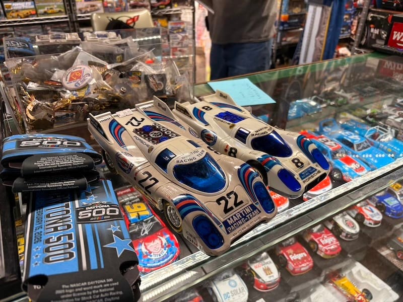 Op vrijdagochtend was ik al vroeg wakker en was daarmee getuige van een prachtige zonsopkomst. Het programma op het circuit begon niet zo vroeg, dus er was nog genoeg tijd voor wat andere activiteiten, samen met Florian Urbitsch, een Duitse vriend die ook in Daytona was. Florian, in het dagelijks leven directeur van het Duitse Nationale Automuseum, is verwoed verzamelaar van modelauto’s en dat was dus ook het doel van onze eerste missie: een bezoek aan de “Flea and Farmers Market”, die in Daytona wekelijks op vrijdag, zaterdag en zondag plaatsvindt op een enorm terrein met meerdere hallen op een paar kilometer van het circuit. Er wordt werkelijk van alles verkocht, van vers groente en fruit via allerlei cowboy-artikelen, meubels en wapens tot aan modelauto’s en autosport-memorabilia. Voor die laatste twee categorieën bezochten we een tweetal winkeltjes, de ene met een enorm aanbod aan modelauto’s in de populaire drie-inch-schaal als Hot Wheels, Matchbox en Mini-GT en de andere met veel NASCAR-auto’s, doorgaans in 1:24, al troffen we er ook twee miniaturen van de Porsche 917 in Martini-kleuren, waaronder de versie met startnummer 22 zoals de winnende auto van Gijs van Lennep/Helmut Marko in Le Mans 1971. Ook stickers, posters, handtekeningkaarten, raceprogramma’s en nog veel meer werden aangeboden. Ik kon de verleiding goed weerstaan. Het volgende doel was Barnes & Noble, het lokale filiaal van de grote boekhandelsketen. Vroeger bevond die winkel zich tegenover de speedway, sinds een paar jaar in een groot nieuwbouwgebied een paar kilometer verder. Een enorme keuze aan boeken en ook lekker veel auto- en autosporttijdschriften. Daar kocht ik wel het een en ander, waaronder een NASCAR-boek en een exemplaar van het geweldige Amerikaanse magazine Automobilia, dat inderdaad gewijd is aan het verzamelen van auto-gerelateerde zaken.