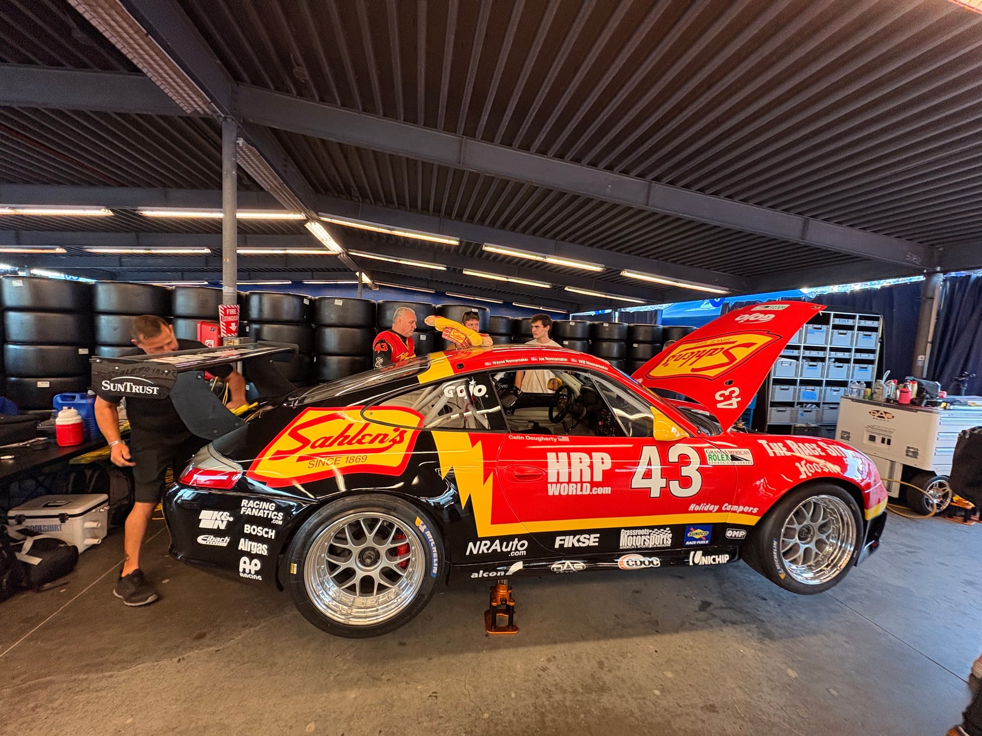 In de loop van de zaterdagavond viel de mist over het circuit, waardoor het traditionele vuurwerk om 22.00 uur al wat lastiger te zien was. De mist werd dichter en dichter, waardoor de wedstrijdleiding in de nacht de race zelfs voor ruim zesenhalf uur neutraliseerde, omdat het zicht te slecht was voor een normaal wedstrijdverloop. Ik was in die tijd in het hotel voor een paar uur slaap, wetend dat de zondag nog lang genoeg zou zijn. Op zondag was ik rond een uur of acht weer op het circuit, waar de wedstrijd weer was vrijgegeven en terwijl de zon was opgekomen genoot ik van een goed ontbijt bij Porsche op het terras. Daarna ging ik weer naar het binnenterrein om daar de laatste uren van de race te volgen. Natuurlijk maakte ik een kleine omweg via het gereserveerde gedeelte van de Porsche Club of America, waar heel wat fraaie Porsches waren opgesteld, van 911’s in allerlei soorten tot een enkele 914, 356 en 928.