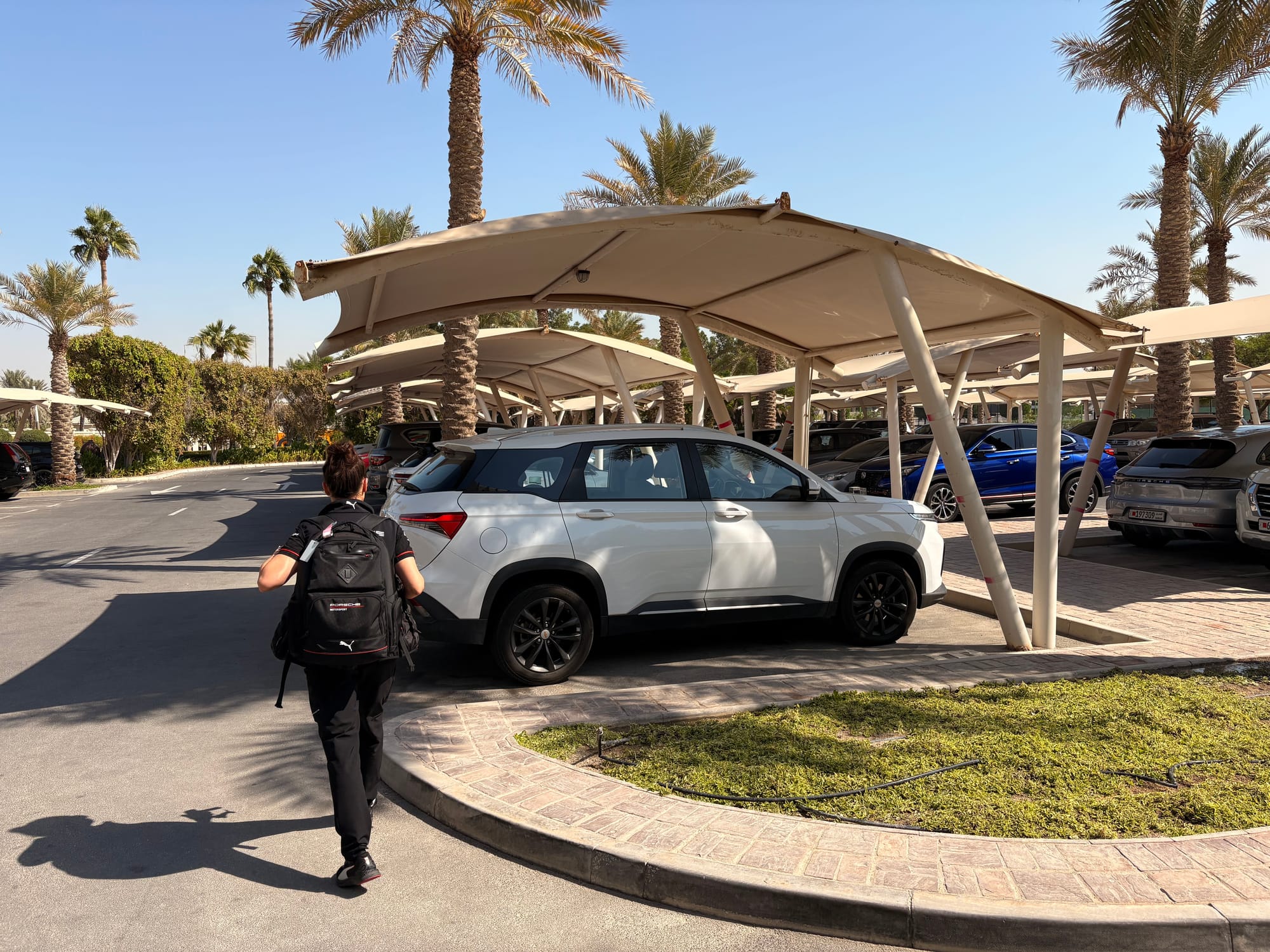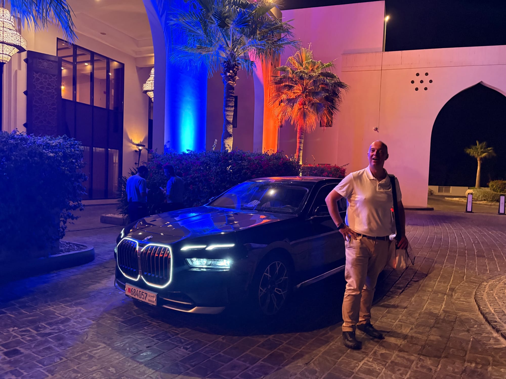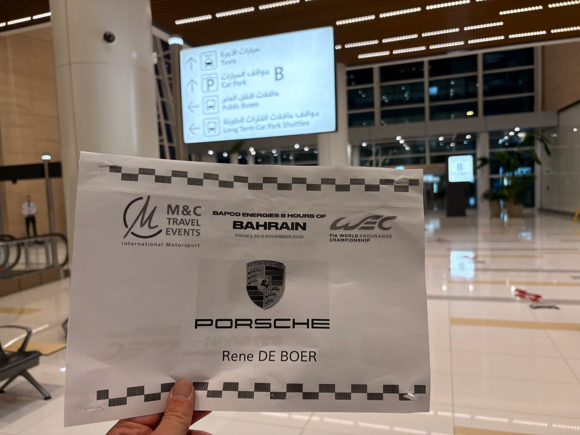 Eenmaal gearriveerd in Bahrein stonden er direct mensen in kleding van het circuit te wachten om arriverende passagiers die iets met de race te maken hadden op te vangen en te begeleiden. Ik meldde me en degene die met mij mee liep wist direct te vertellen dat er een chauffeur voor transport naar het hotel op me stond te wachten. Ik werd vlot door de douane geleid – de benodigde visa waren keurig via het circuit geregeld – en met alleen handbagage stond ik binnen vijf minuten na landing in de aankomsthal, waar inderdaad iemand met een bordje met mijn naam en een Porsche-logo erop klaarstond.