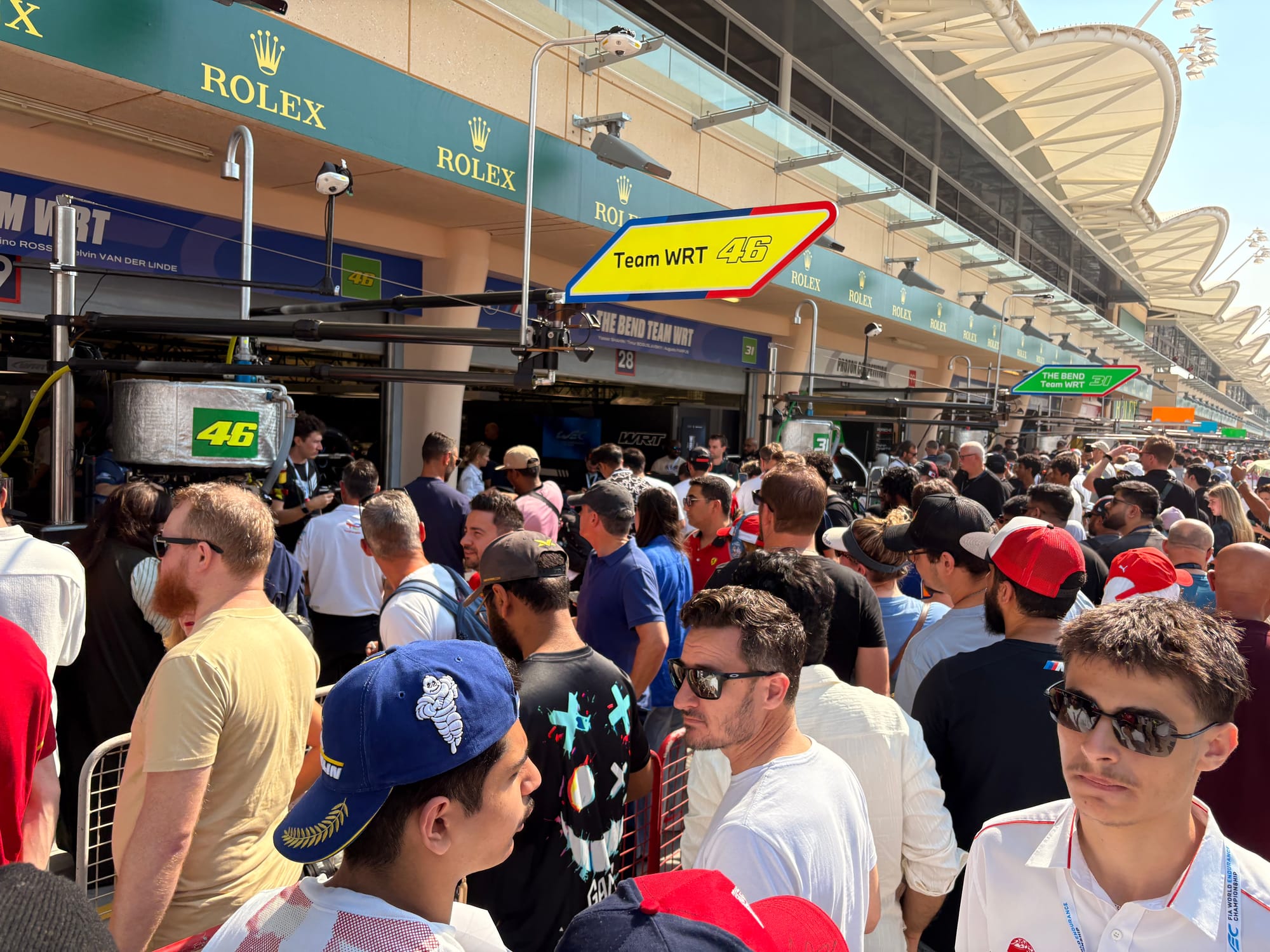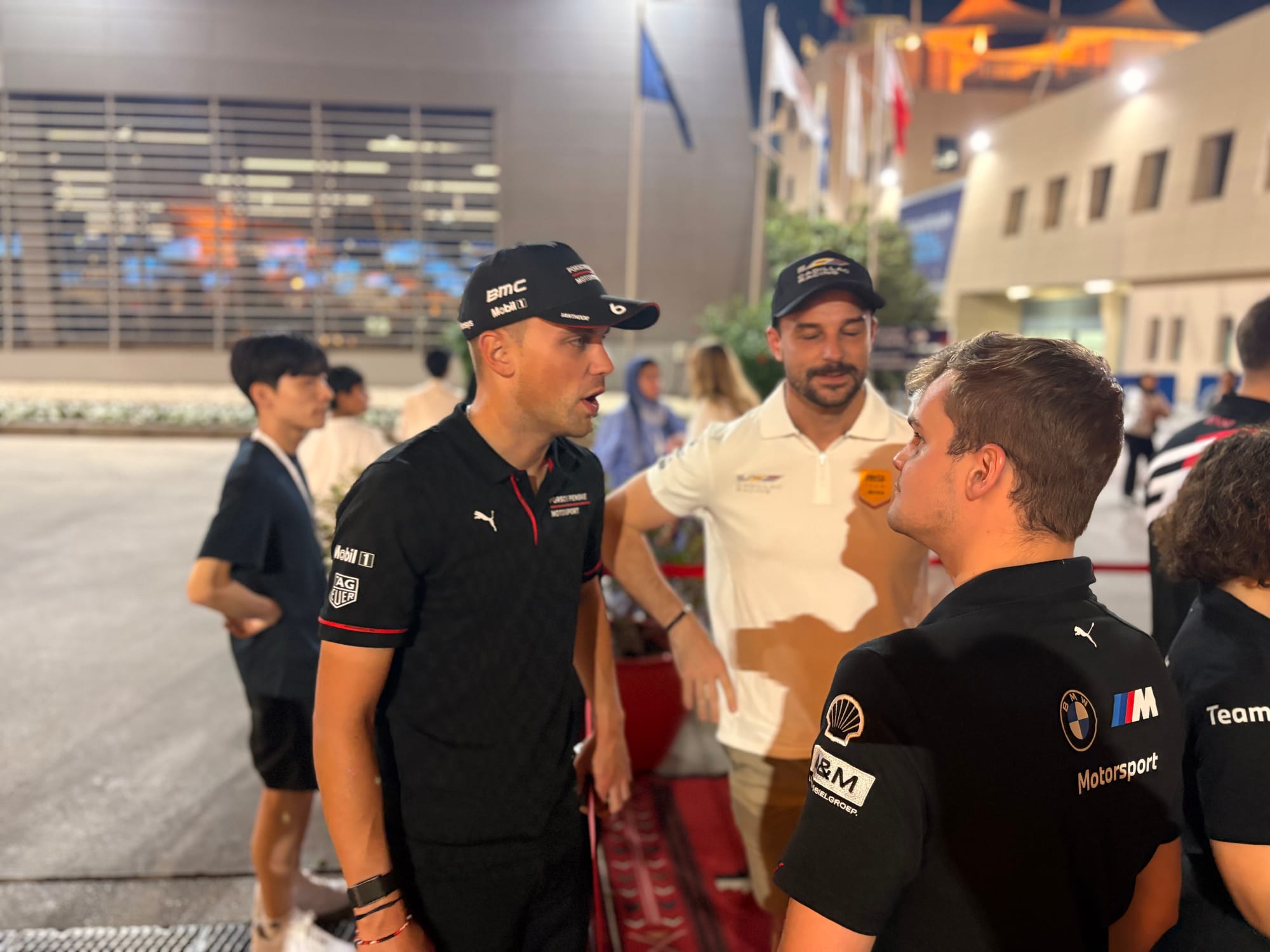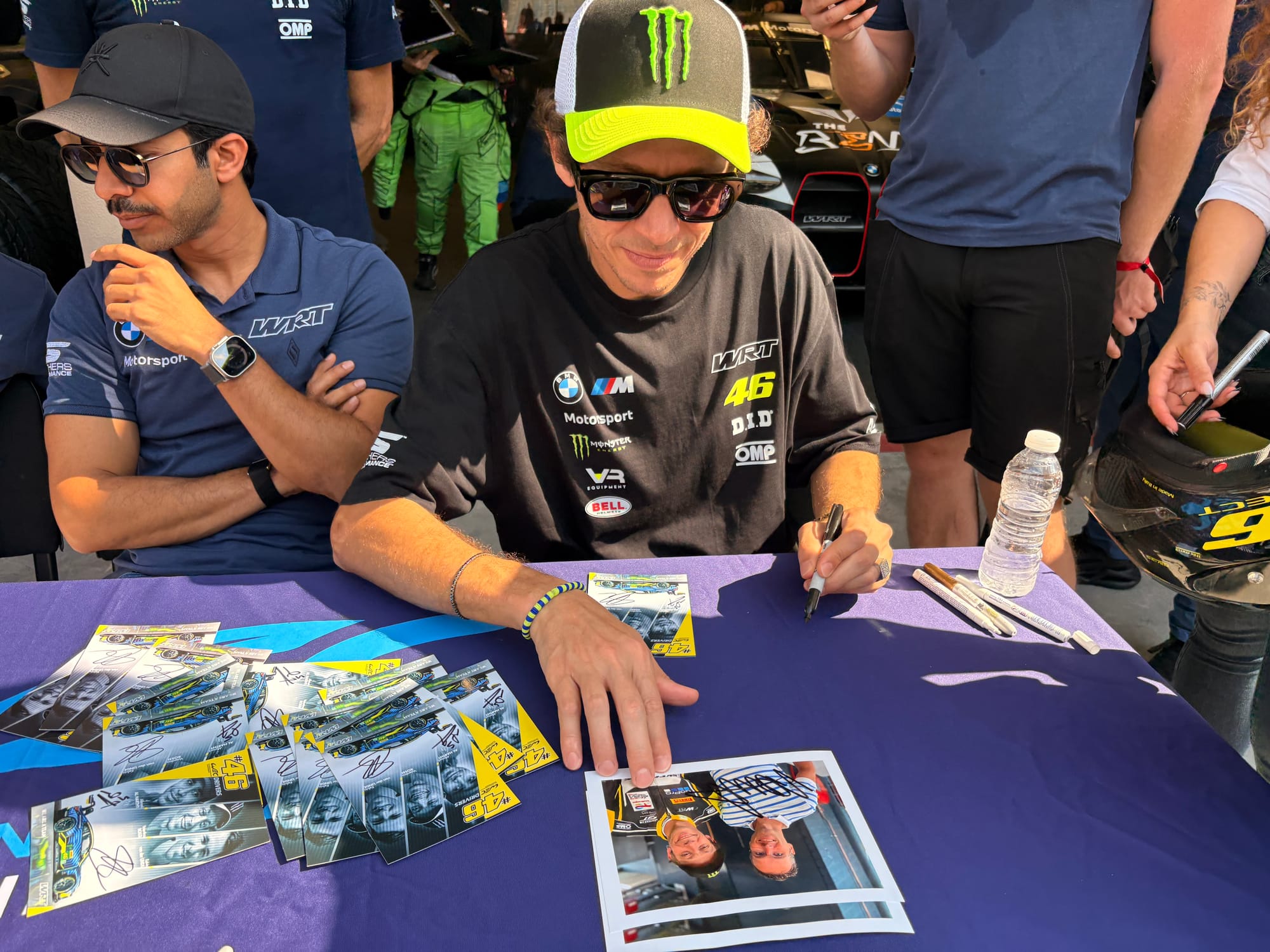 Na opnieuw een uitstekende nachtrust en een heerlijk ontspannen ontbijt was het wederom tijd voor het circuit: het was racedag! Na het nodige schrijfwerk en het met een half oog volgen van de tweede Carrera Cup-race verruilden we het perscentrum met airco voor de zonovergoten en hete pitstraat, want de handtekeningsessie stond op het programma, altijd een prima gelegenheid om nog even met coureurs te spreken voor aanvang van de race. We hadden een speciale missie voor een vriend die een foto van hemzelf met Valentino Rossi gesigneerd wilde hebben. Om Rossi heen is er altijd een enorme drukte tijdens race-evenementen, want zijn schare fans is eindeloos, maar we constateerden vorig jaar al dat de drukte in Bahrein relatief meeviel, dus we besloten om dat daar te doen, wat ook inderdaad prima lukte, met een alleszins acceptabele wachttijd van een minuut of tien. Vincent Vosse, de baas van het BMW-raceteam waarvoor Rossi rijdt, moest lachen toen hij uw verslaggever in de rij zag staan. “Je had het ook even kunnen vragen, dan had ik het voor je geregeld”, zei hij. Maar dat doen we niet: voor dit soort dingen zijn we gewoon bezoeker net als alle andere aanwezigen, dus gewoon met alle anderen in de rij.