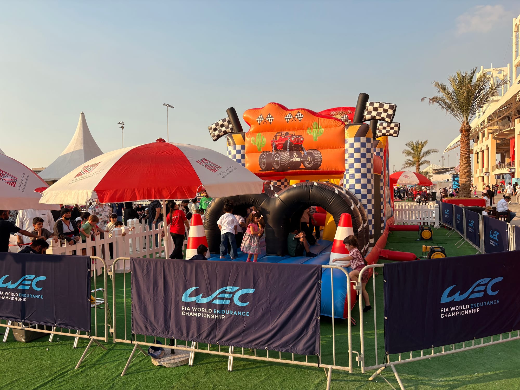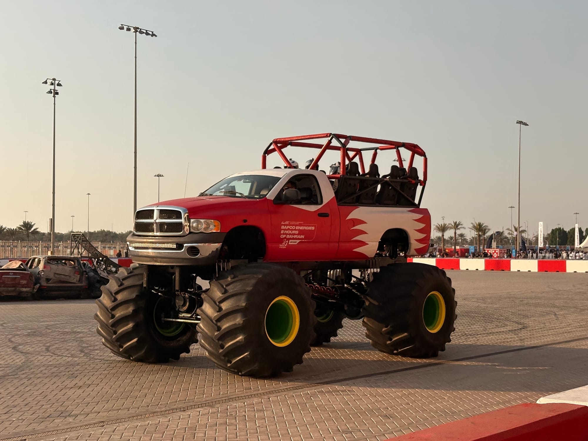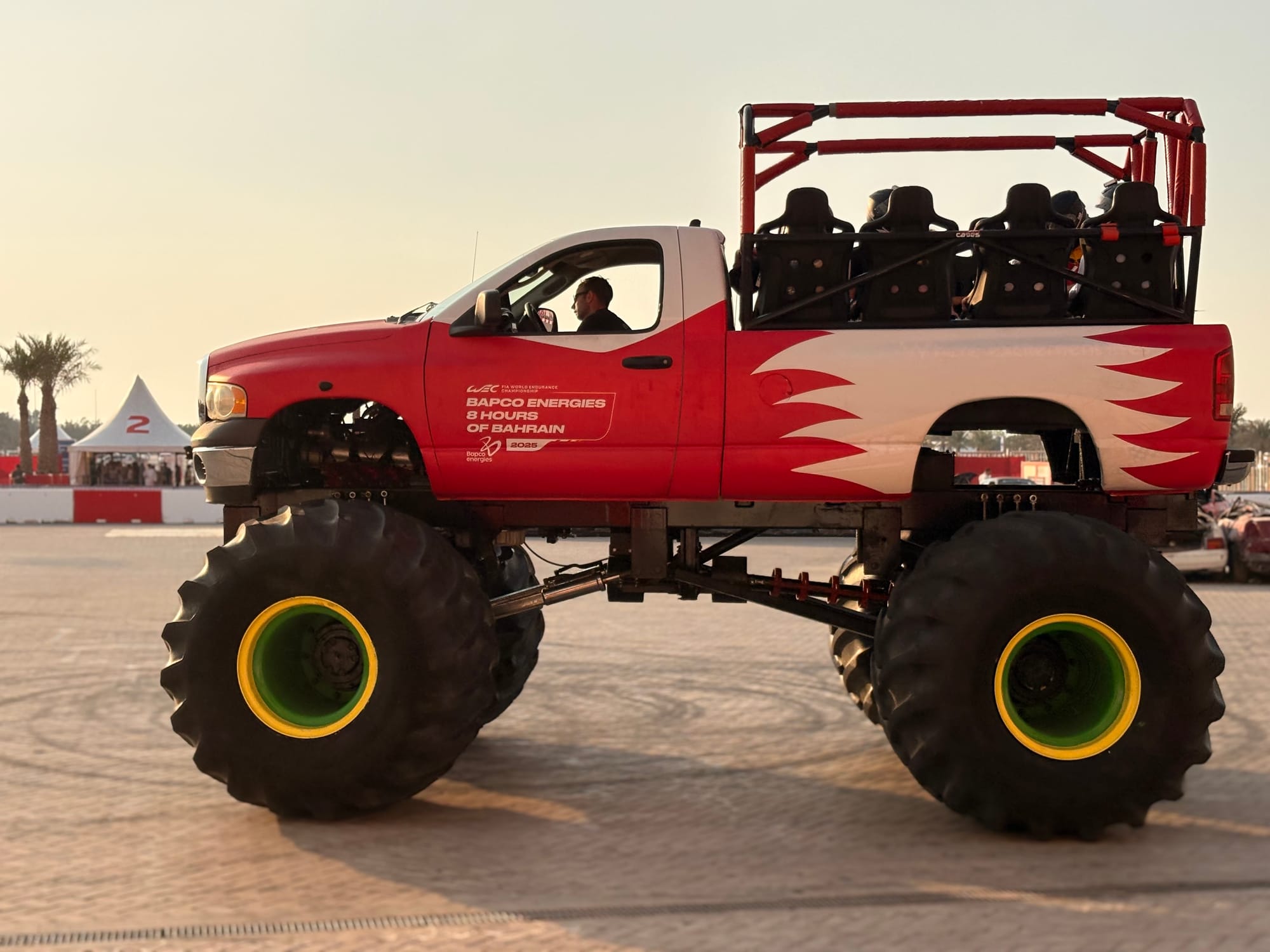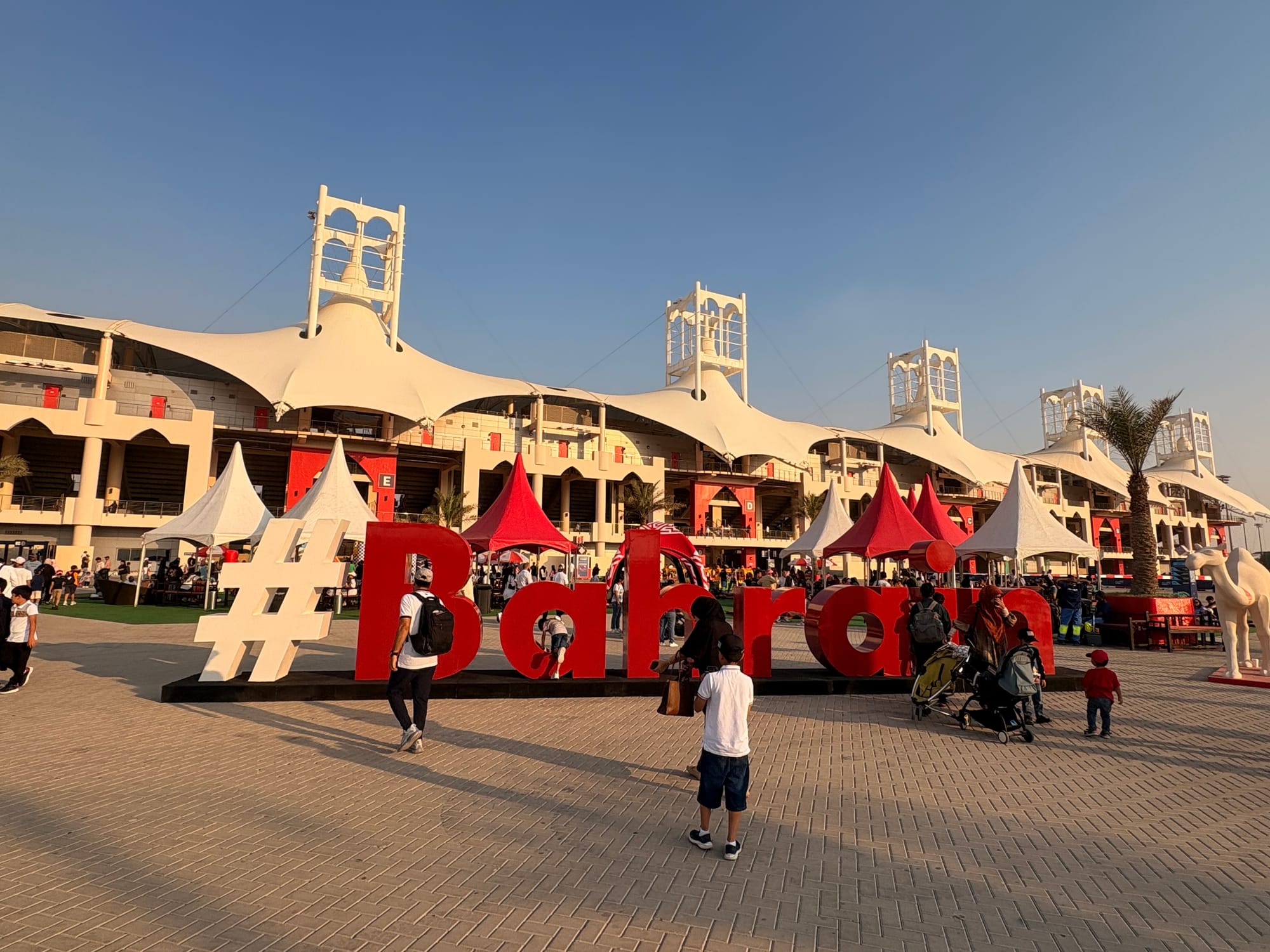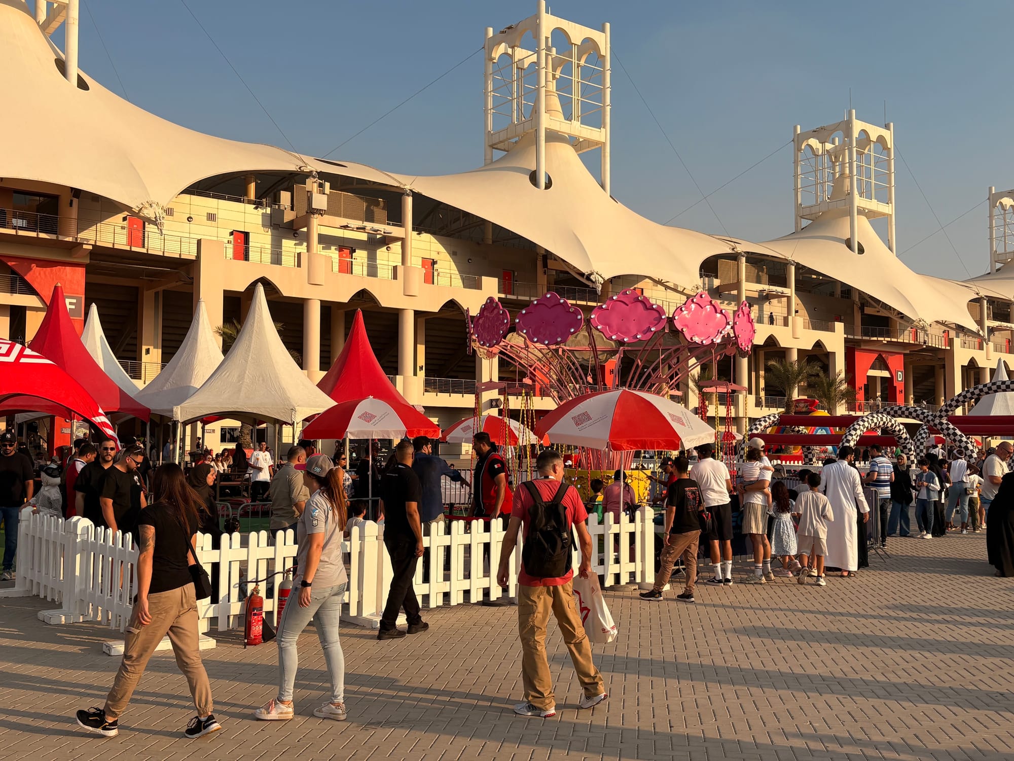 Na een goed halfuur op de grid zochten we het perscentrum weer op om van daar uit de beginfase van de race te volgen. In de regel zijn races in Bahrein niet zo spectaculair, omdat het circuit weinig inhaalmogelijkheden biedt. Daarmee is de beginfase dus van extra belang. Toen de race enigszins ‘in een plooi gevallen was’, zoals men dat in Vlaanderen zo mooi noemt, namen we wat tijd voor een rondje door de ‘fan area’ achter de grote hoofdtribune. Inmiddels trad de schemering in (in Bahrein gaat de zon in deze tijd van het jaar al voor vijf uur onder en is het ook heel snel donker) en was het ook wat koeler geworden, zo’n 25 graden. Er was een parcours voor ‘monster trucks’, waarbij passagiers ook achterin konden meerijden, er waren diverse stands met catering, er was een flink oppervlak als ‘lounge area’ en er waren promotiestands van Toyota, BMW en Ford. Het circuit zelf had een flinke merchandisewinkel waar de typische geur van waarschijnlijk Chinese kunststof rommel hing, Er was niets dat enige bezitsdrang opriep.
