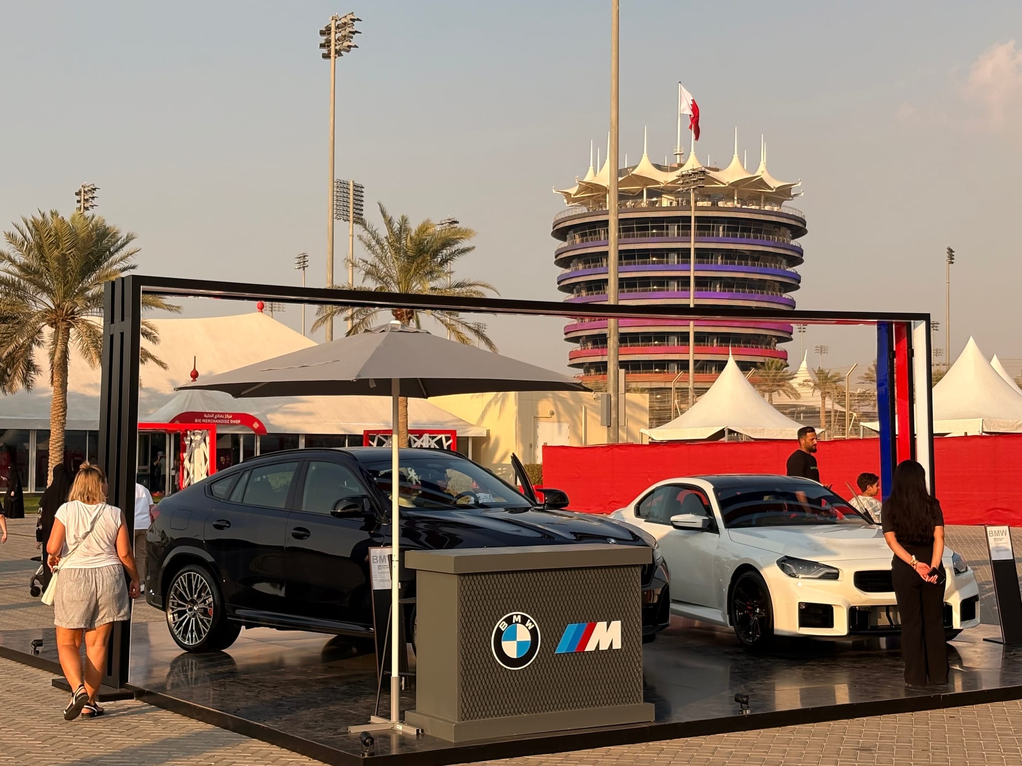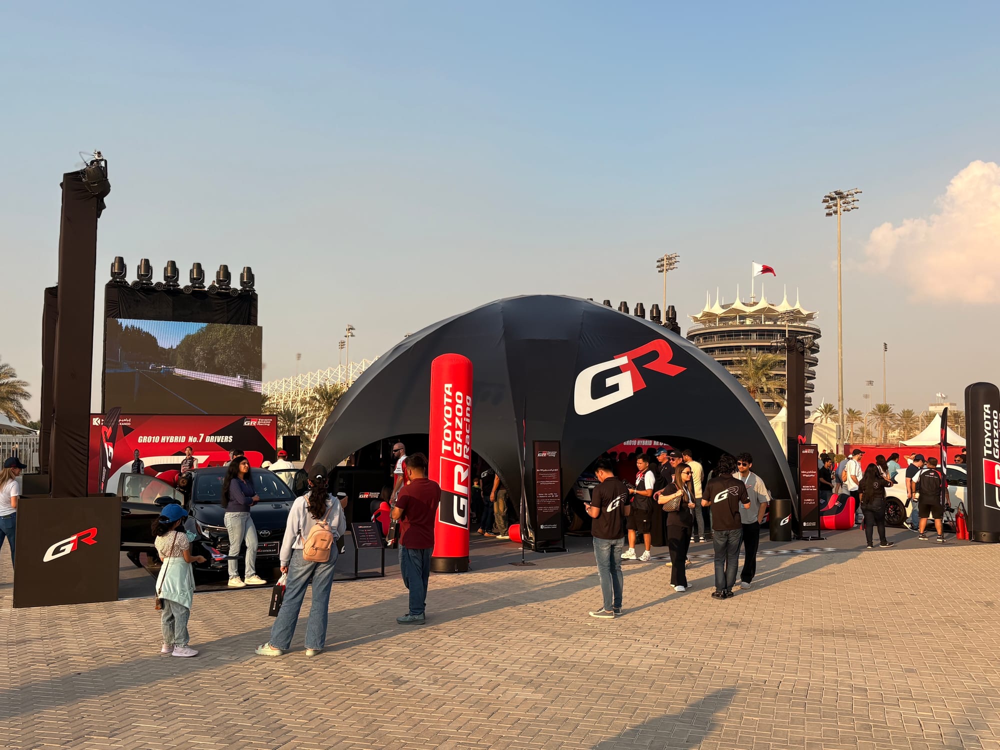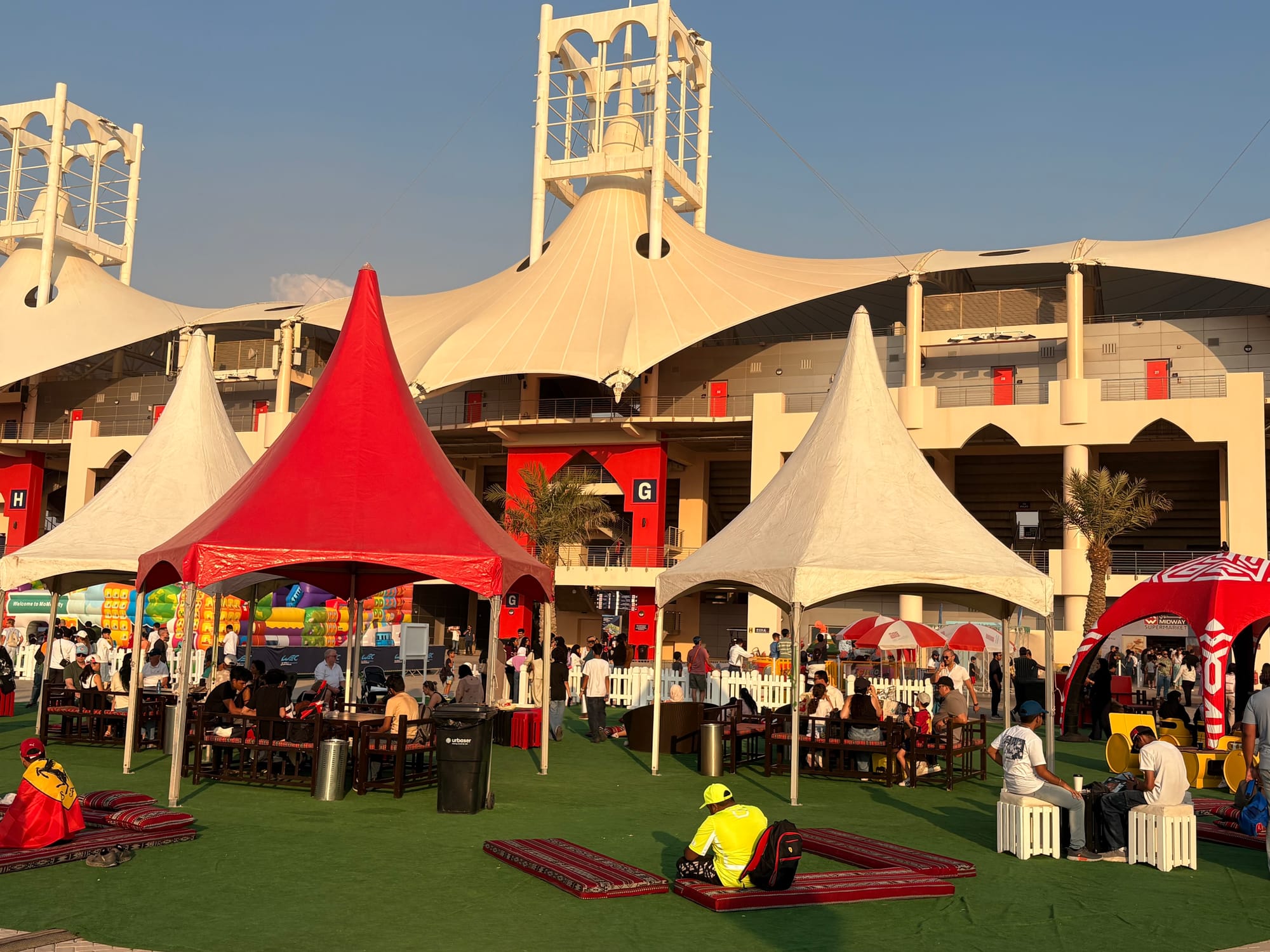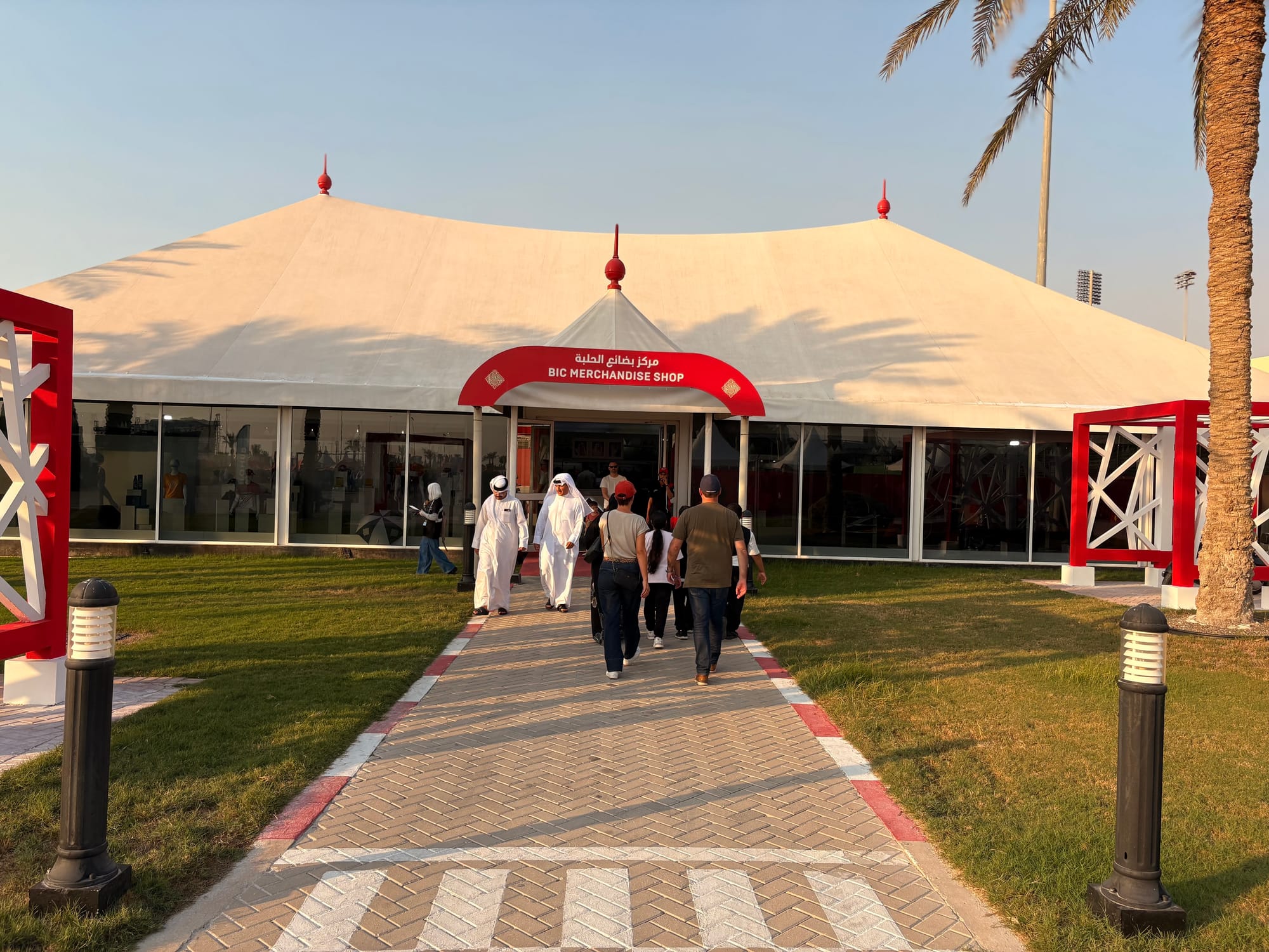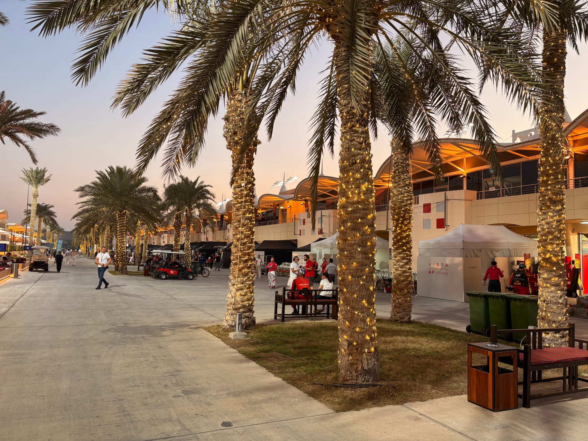 Na een goed halfuur op de grid zochten we het perscentrum weer op om van daar uit de beginfase van de race te volgen. In de regel zijn races in Bahrein niet zo spectaculair, omdat het circuit weinig inhaalmogelijkheden biedt. Daarmee is de beginfase dus van extra belang. Toen de race enigszins ‘in een plooi gevallen was’, zoals men dat in Vlaanderen zo mooi noemt, namen we wat tijd voor een rondje door de ‘fan area’ achter de grote hoofdtribune. Inmiddels trad de schemering in (in Bahrein gaat de zon in deze tijd van het jaar al voor vijf uur onder en is het ook heel snel donker) en was het ook wat koeler geworden, zo’n 25 graden. Er was een parcours voor ‘monster trucks’, waarbij passagiers ook achterin konden meerijden, er waren diverse stands met catering, er was een flink oppervlak als ‘lounge area’ en er waren promotiestands van Toyota, BMW en Ford. Het circuit zelf had een flinke merchandisewinkel waar de typische geur van waarschijnlijk Chinese kunststof rommel hing, Er was niets dat enige bezitsdrang opriep.
