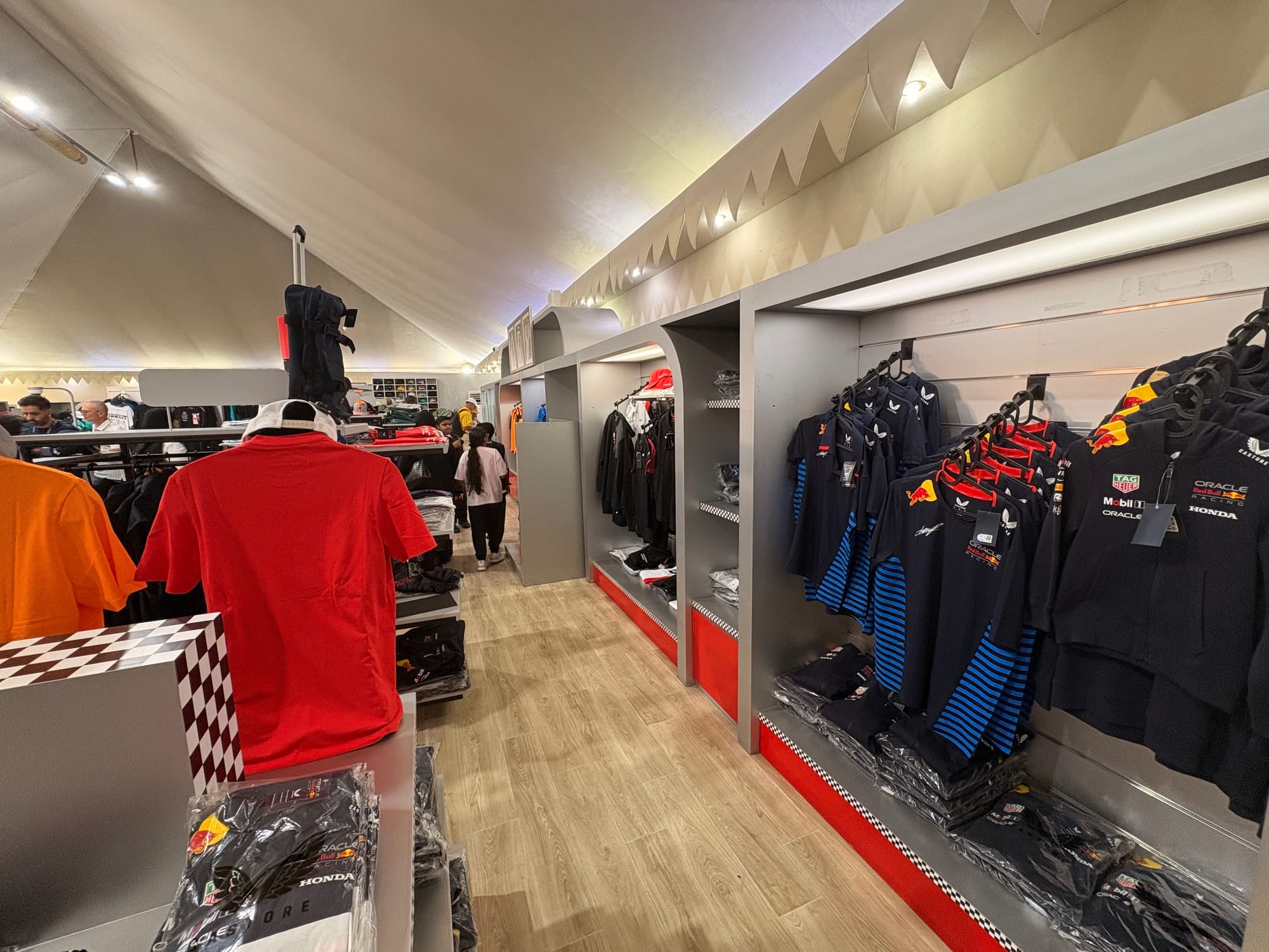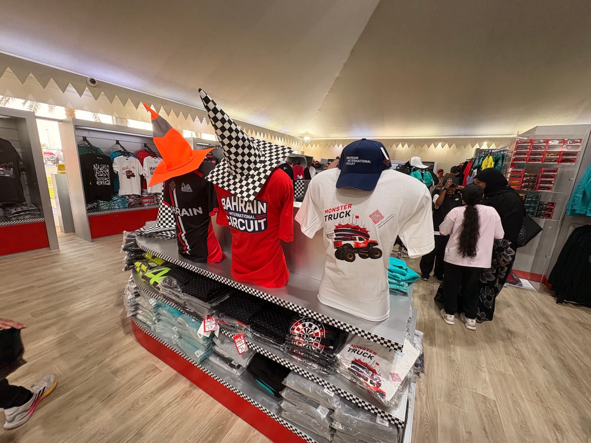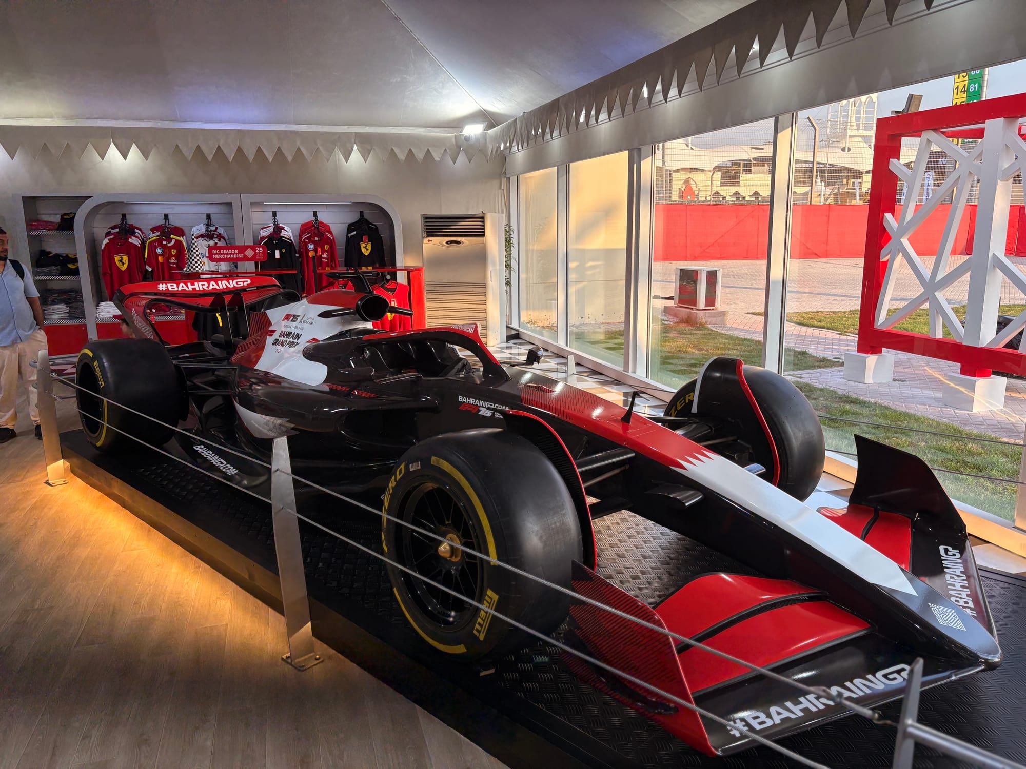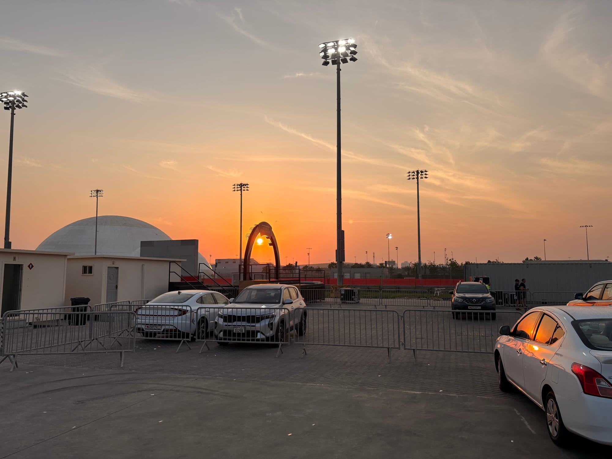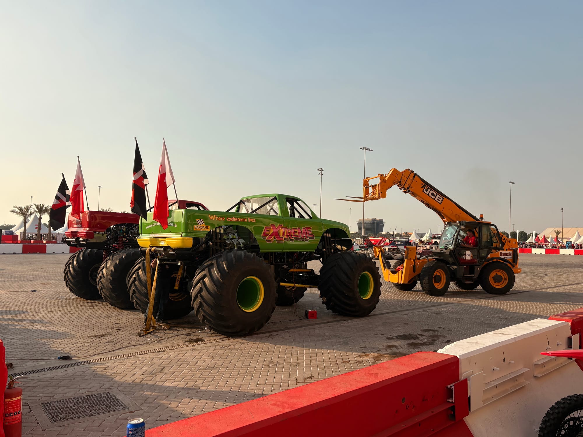 Na een goed halfuur op de grid zochten we het perscentrum weer op om van daar uit de beginfase van de race te volgen. In de regel zijn races in Bahrein niet zo spectaculair, omdat het circuit weinig inhaalmogelijkheden biedt. Daarmee is de beginfase dus van extra belang. Toen de race enigszins ‘in een plooi gevallen was’, zoals men dat in Vlaanderen zo mooi noemt, namen we wat tijd voor een rondje door de ‘fan area’ achter de grote hoofdtribune. Inmiddels trad de schemering in (in Bahrein gaat de zon in deze tijd van het jaar al voor vijf uur onder en is het ook heel snel donker) en was het ook wat koeler geworden, zo’n 25 graden. Er was een parcours voor ‘monster trucks’, waarbij passagiers ook achterin konden meerijden, er waren diverse stands met catering, er was een flink oppervlak als ‘lounge area’ en er waren promotiestands van Toyota, BMW en Ford. Het circuit zelf had een flinke merchandisewinkel waar de typische geur van waarschijnlijk Chinese kunststof rommel hing, Er was niets dat enige bezitsdrang opriep.